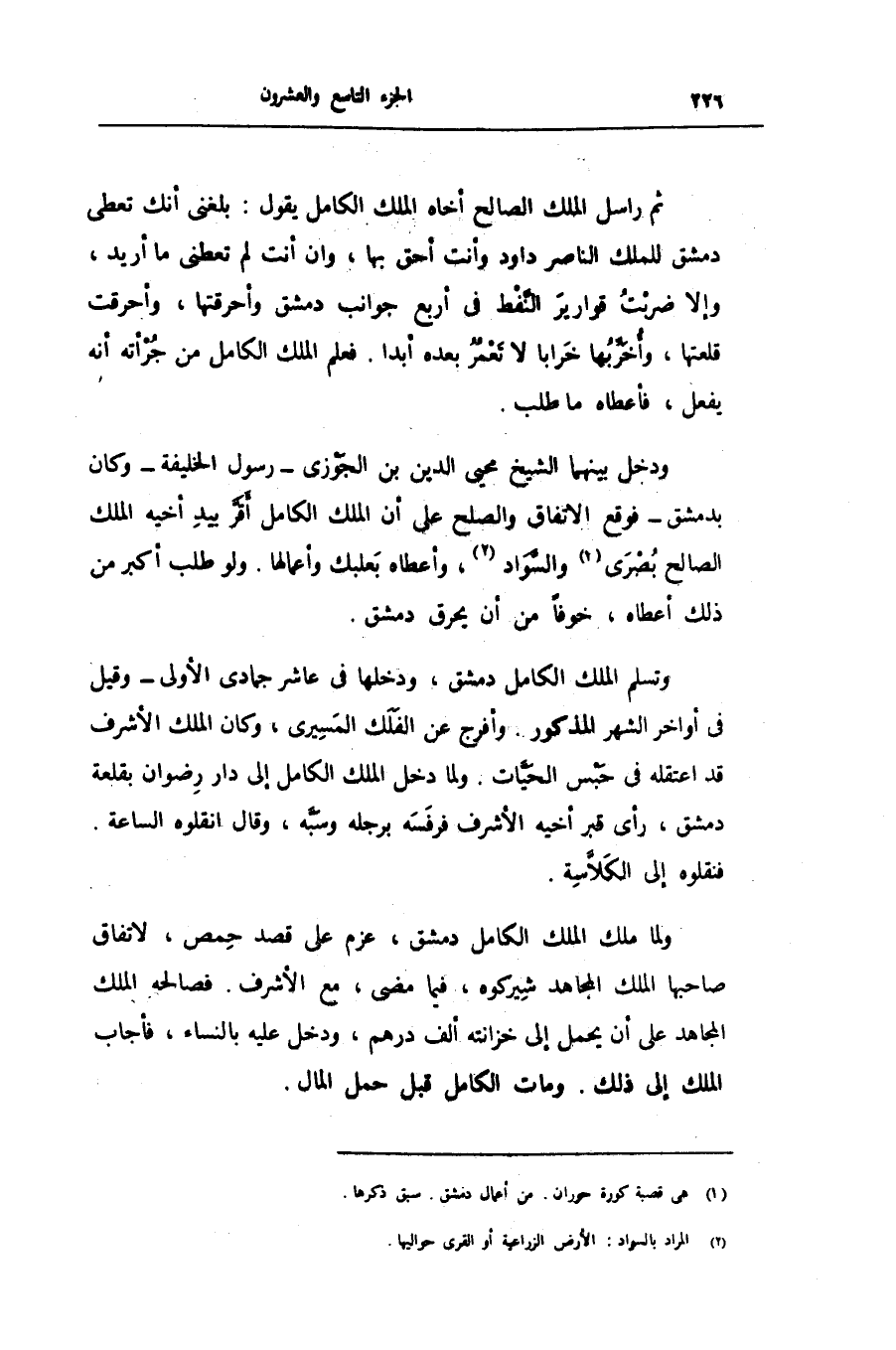ودخل بينهما الشيخ محيى الدين بن الجوزى- رسول الخليفة- وكان بدمشق- فوقع الاتفاق والصلح على أن الملك الكامل أقرّ بيد أخيه الملك الصالح بصرى «1» والسّواد «2» ، وأعطاه بعلبك وأعمالها. ولو طلب أكبر من ذلك أعطاه، خوفا من أن يحرق دمشق.