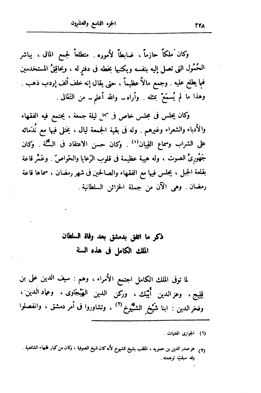 لما توفى الملك الكامل اجتمع الأمراء، وهم: سيف الدين على بن قليج، وعز الدين أيبك، وركن الدين الهيجاوى، وعماد الدين، وفخر الدين: ابنا شيخ الشّيوخ «2» ، وتشاوروا فى أمر دمشق، وانفصلوا