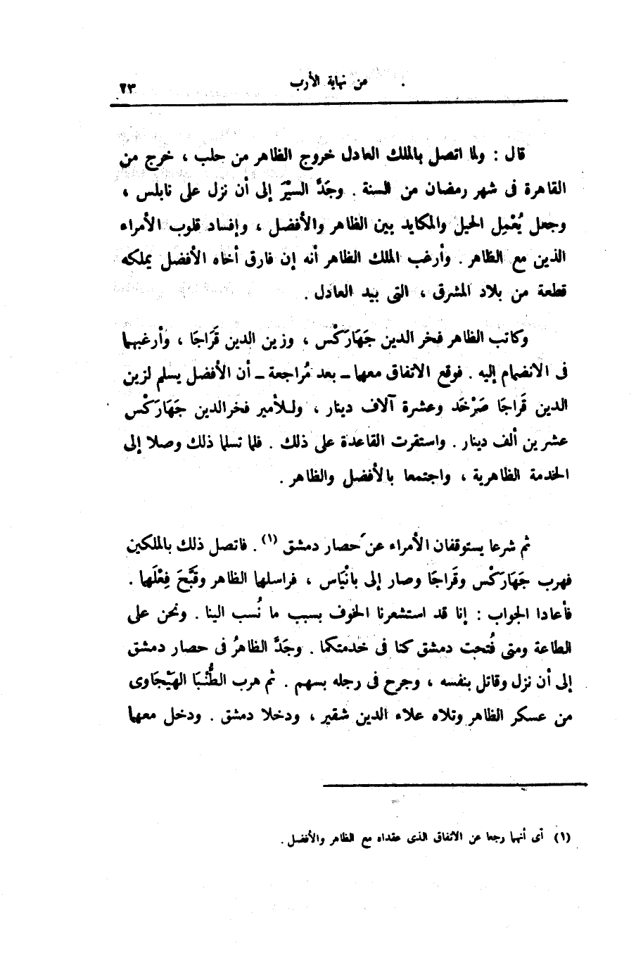 فأعادا الجواب: إنا قد استشعرنا الخوف بسبب ما نسب إلينا. ونحن على الطاعة ومتى فتحت دمشق كنا فى خدمتكما. وجدّ الظاهر فى حصار دمشق إلى أن نزل وقاتل بنفسه، وجرح فى رجله بسهم. ثم هرب الطّنبا الهيجاوى من عسكر الظاهر وتلاه علاء الدين شقير، ودخلا دمشق. ودخل معهما