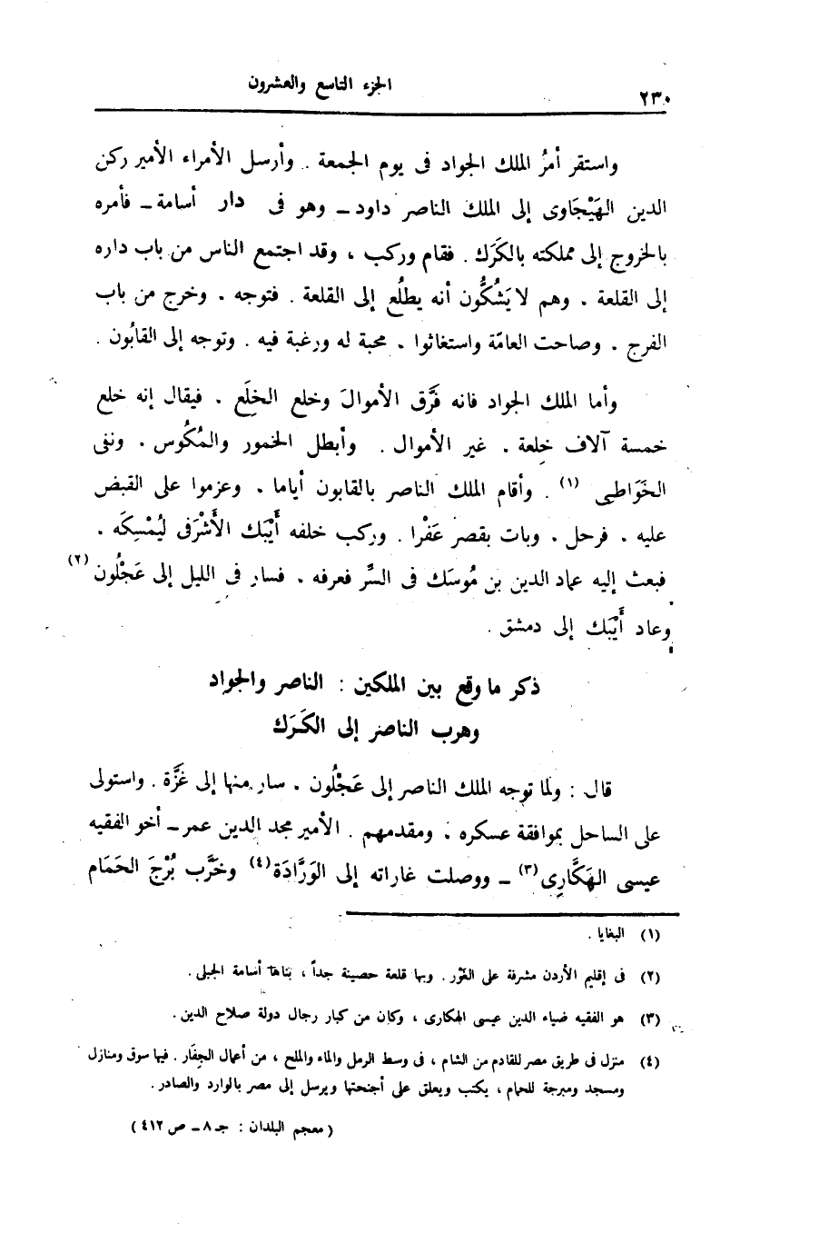 واستقر أمر الملك الجواد فى يوم الجمعة. وأرسل الأمراء الأمير ركن الدين الهيجاوى إلى الملك الناصر داود- وهو فى دار أسامة- فأمره بالخروج إلى مملكته بالكرك. فقام وركب، وقد اجتمع الناس من باب داره إلى القلعة. وهم لا يشكّون أنه يطلع إلى القلعة. فتوجه. وخرج من باب الفرج، وصاحت العامّة واستغاثوا. محبة له ورغبة فيه. وتوجه إلى القابون.