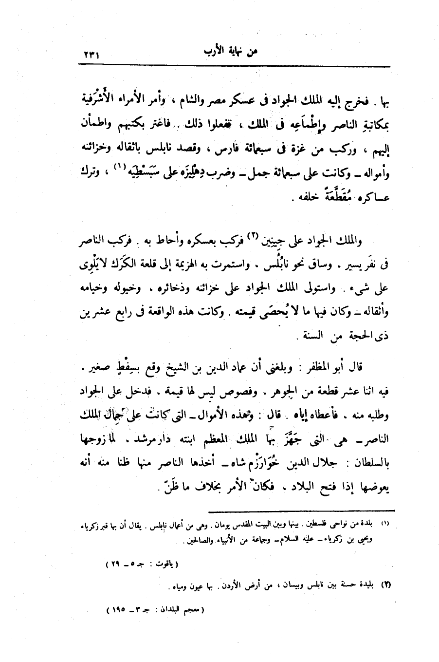والملك الجواد على جينين «2» فركب بعسكره وأحاط به. فركب الناصر فى نفر يسير، وساق نحو نابلس، واستمرت به الهزيمة إلى قلعة الكرك لا يلوى على شىء. واستولى الملك الجواد على خزائنه وذخائره، وخيوله وخيامه وأثقاله- وكان فيها ما لا يحصى قيمته. وكانت هذه الواقعة فى رابع عشرين ذى الحجة من السنة.