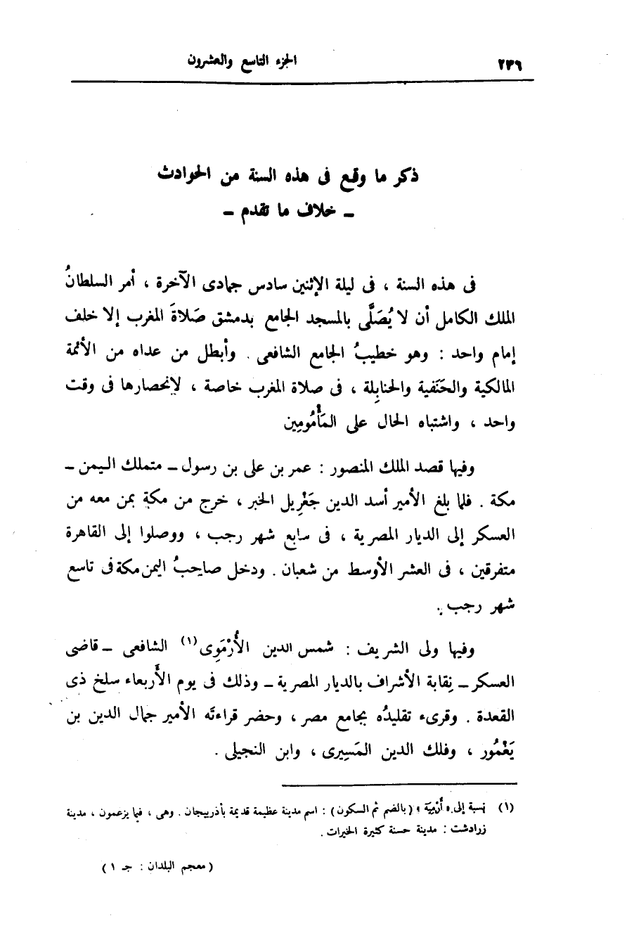 فى هذه السنة، فى ليلة الإثنين سادس جمادى الآخرة، أمر السلطان الملك الكامل أن لا يصلّى بالمسجد الجامع بدمشق صلاة المغرب إلا خلف إمام واحد: وهو خطيب الجامع الشافعى. وأبطل من عداه من الأئمة المالكية والحنفية والحنابلة، فى صلاة المغرب خاصة، لانحصارها فى وقت واحد، واشتباه الحال على المأمومين وفيها قصد الملك المنصور: عمر بن على بن رسول- متملك اليمن- مكة. فلما بلغ الأمير أسد الدين جغريل الخبر، خرج من مكة بمن معه من العسكر إلى الديار المصرية، فى سابع شهر رجب، ووصلوا إلى القاهرة متفرقين، فى العشر الأوسط من شعبان. ودخل صاحب اليمن مكة فى تاسع شهر رجب.