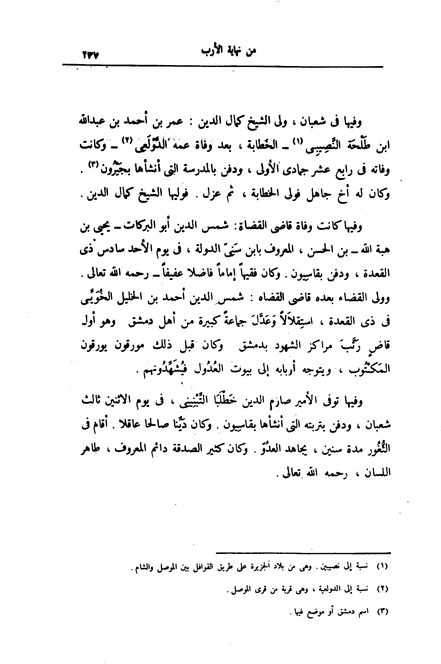 وفيها فى شعبان، ولى الشيخ كمال الدين: عمر بن أحمد بن عبد الله ابن طلحة النّصيبى «1» - الخطابة، بعد وفاة عمه الدّولعى «2» - وكانت وفاته فى رابع عشر جمادى الأولى، ودفن بالمدرسة التى أنشأها بجيرون «3» .