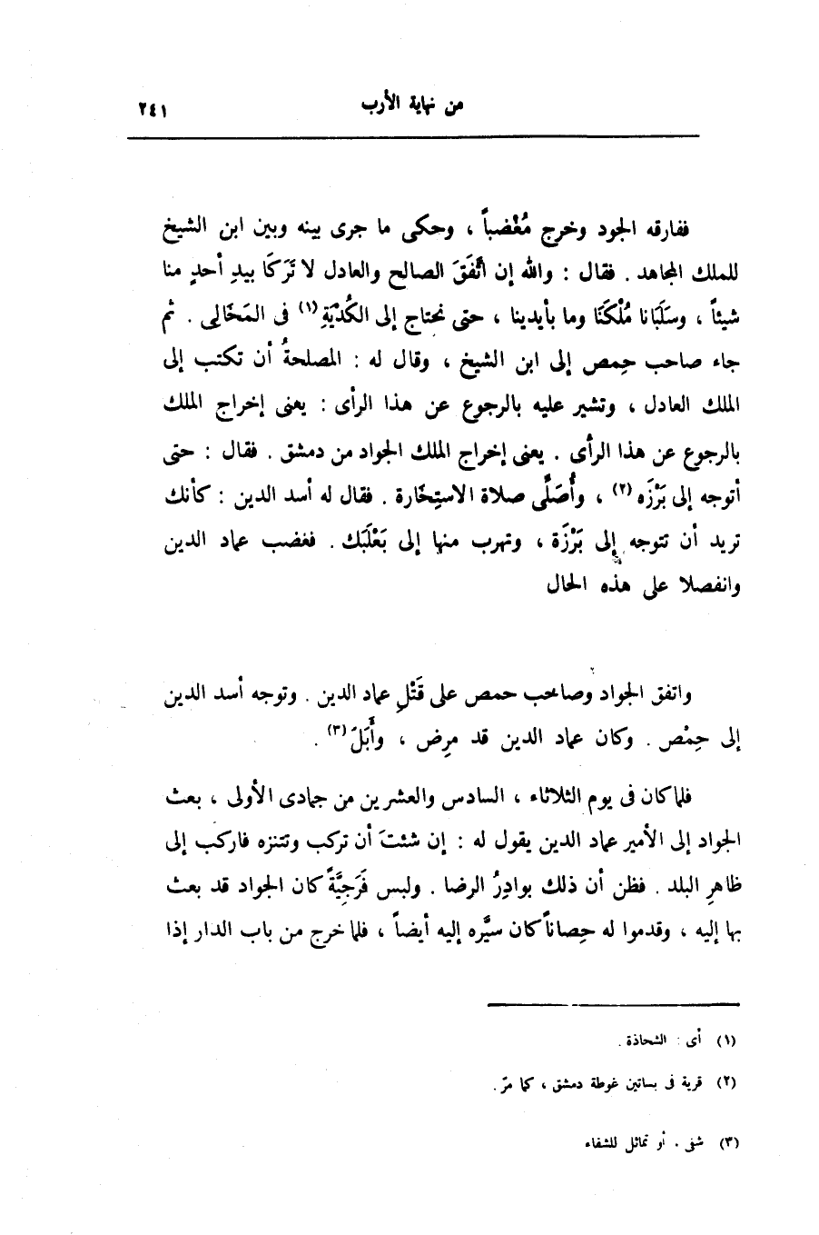 ففارقه الجود وخرج مغضبا، وحكى ما جرى بينه وبين ابن الشيخ للملك المجاهد. فقال: والله إن اتّفق الصالح والعادل لا تركا بيد أحد منا شيئا، وسلبانا ملكنا وما بأيدينا، حتى نحتاج إلى الكدية «1» فى المخالى. ثم جاء صاحب حمص إلى ابن الشيخ، وقال له: المصلحة أن تكتب إلى الملك العادل، وتشير عليه بالرجوع عن هذا الرأى: يعنى إخراج الملك بالرجوع عن هذا الرأى. يعنى إخراج الملك الجواد من دمشق. فقال: حتى أتوجه إلى برزه «2» ، وأصلّى صلاة الاستخارة. فقال له أسد الدين: كأنك تريد أن تتوجه إلى برزة، وتهرب منها إلى بعلبك. فغضب عماد الدين وانفصلا على هذه الحال واتفق الجواد وصاحب حمص على قتل عماد الدين وتوجه أسد الدين إلى حمص. وكان عماد الدين قد مرض، وأبل «3» .