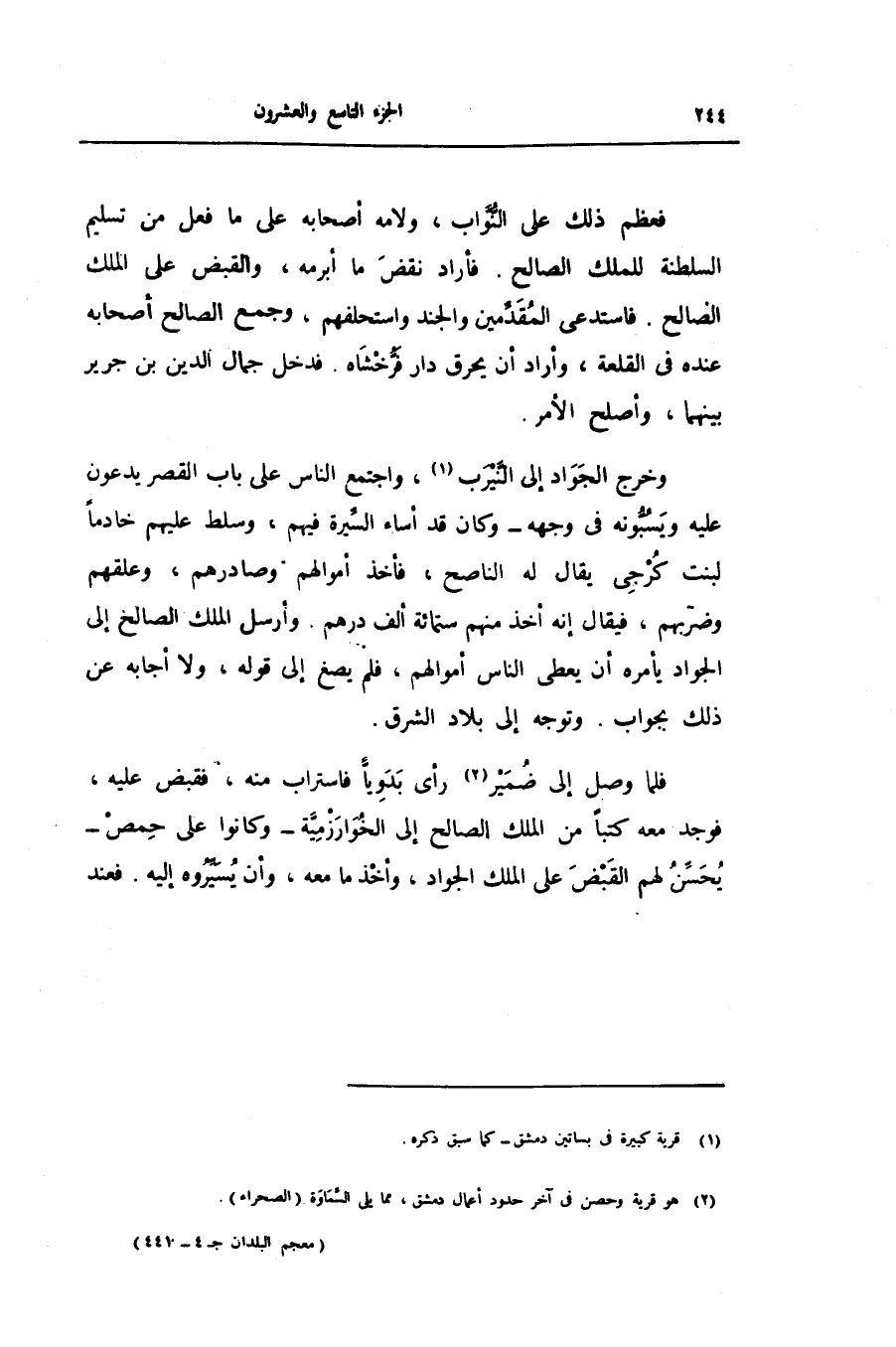 فلما وصل إلى ضمير «2» رأى بدويّا فاستراب منه، فقبض عليه، فوجد معه كتبا من الملك الصالح إلى الخوارزميّة- وكانوا على حمص- يحسّن لهم القبض على الملك الجواد، وأخذ ما معه، وأن يسيّروه إليه. فعند