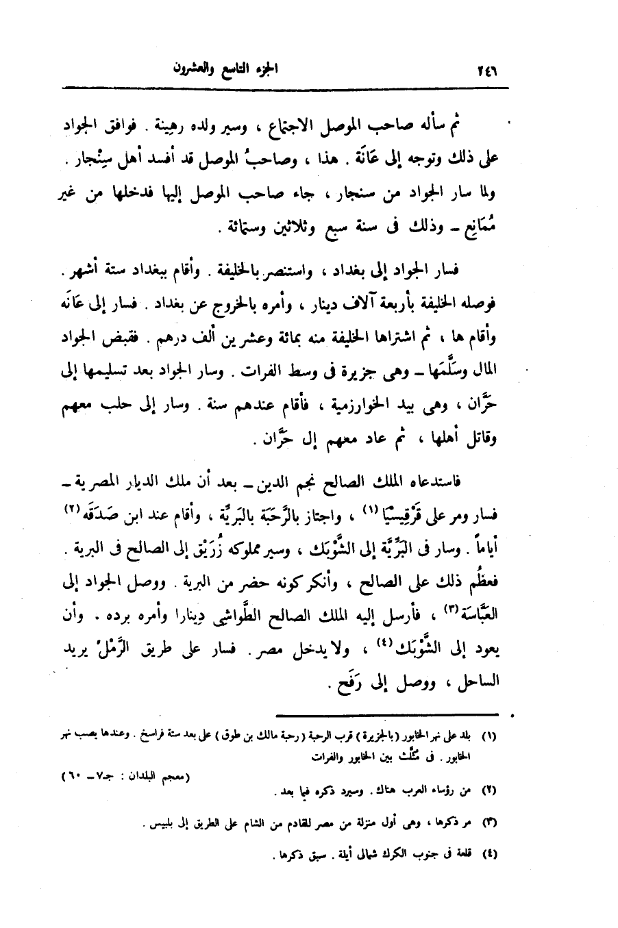 فوصله الخليفة بأربعة آلاف دينار، وأمره بالخروج عن بغداد. فسار إلى عانه وأقام ها، ثم اشتراها الخليفة منه بمائة وعشرين ألف درهم. فقبض الجواد المال وسلّمها- وهى جزيرة فى وسط الفرات. وسار الجواد بعد تسليمها إلى حرّان، وهى بيد الخوارزمية، فأقام عندهم سنة. وسار إلى حلب معهم وقاتل أهلها، ثم عاد معهم الى حرّان.