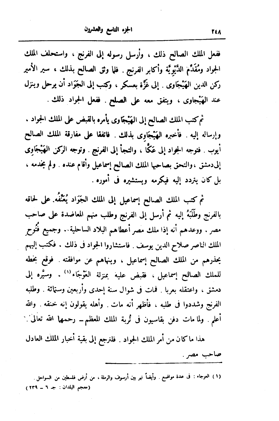 ثم كتب الملك الصالح إسماعيل إلى الملك الجواد يعنّفه. على لحاقه بالفرنج وطلبه إليه ثم أرسل إلى الفرنج وطلب منهم المعاضدة على صاحب مصر. ووعدهم أنه إذا ملك مصر أعطاهم البلاد الساحلية. وجميع فتوح الملك الناصر صلاح الدين يوسف. فاستشاروا الجواد فى ذلك، فكتب إليهم يحذرهم من الملك الصالح إسماعيل، وينهاهم عن موافقته. فوقع بخطه للملك الصالح إسماعيل، فقبض عليه بمنزلة العوجاء «1» ، وسيّره إلى دمشق، واعتقله بعربا. فمات فى شوال سنة إحدى وأربعين وستمائة. وطلبه الفرنج وشددوا فى طلبه، فأظهر أنه مات. وأهله يقولون إنه خنقه. والله أعلم. ولما مات دفن بقاسيون فى تربة الملك المعظم- رحمهما الله تعالى.