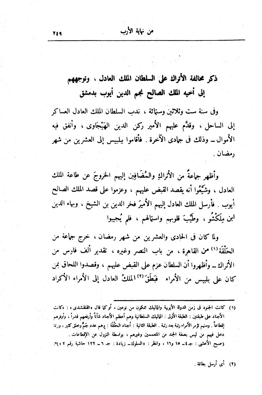 وأظهر جماعة من الأتراك والمضافين إليهم الخروج عن طاعة الملك العادل، وشيّعوا أنه يقصد القبض عليهم، وعزموا على قصد الملك الصالح أيوب. فأرسل الملك العادل إليهم الأمير فخر الدين بن الشيخ، وبهاء الدين ابن ملكشو، وطيّب قلوبهم واستمالهم، فلم يجيبوا ولما كان فى الحادى والعشرين من شهر رمضان، خرج جماعة من الحلقة «1» من القاهرة، من باب النصر وغيره، تقدير ألف فارس من الأتراك- وأظهروا أن السلطان عزم على القبض عليهم، وقصدوا اللحاق بمن كان على بلبيس من الأمراء فبطق «2» الملك العادل إلى الأمراء الأكراد
