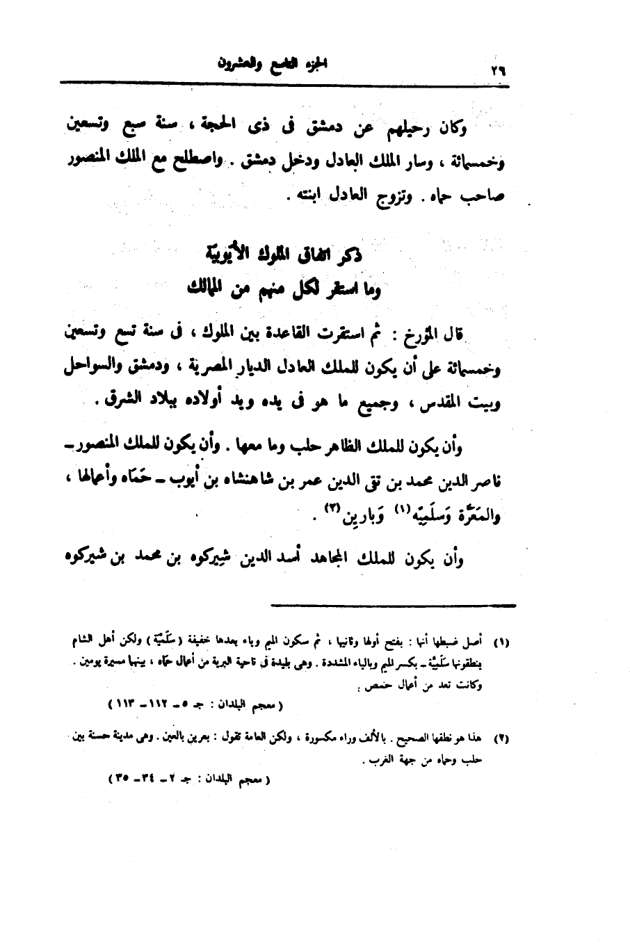 وأن يكون للملك الظاهر حلب وما معها. وأن يكون للملك المنصور- ناصر الدين محمد بن تقى الدين عمر بن شاهنشاه بن أيوب- حماه وأعمالها، والمعرّة وسلميّه «1» وبارين «2» .
