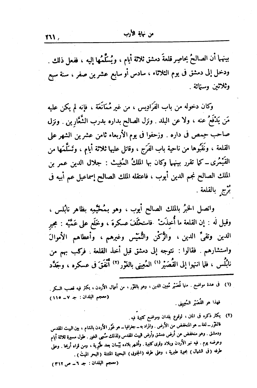 واتصل الخبر بالملك الصالح أيوب، وهو بمخيّمه بظاهر نابلس، وقيل له: إن القلعة ما أخذت فاستحلف عسكره، وخلع على عمّيه: مجير الدين وتقىّ الدين، والرّكن والنّميس وغيرهم، وأعطاهم الأموال واستشارهم. فقالوا: نتوجه إلى دمشق قبل أخذ القلعة. فركب بهم من نابلس، فلما انتهوا إلى القصير «1» المعينى بالغور «2» أنفق فى عسكره، وجدّد