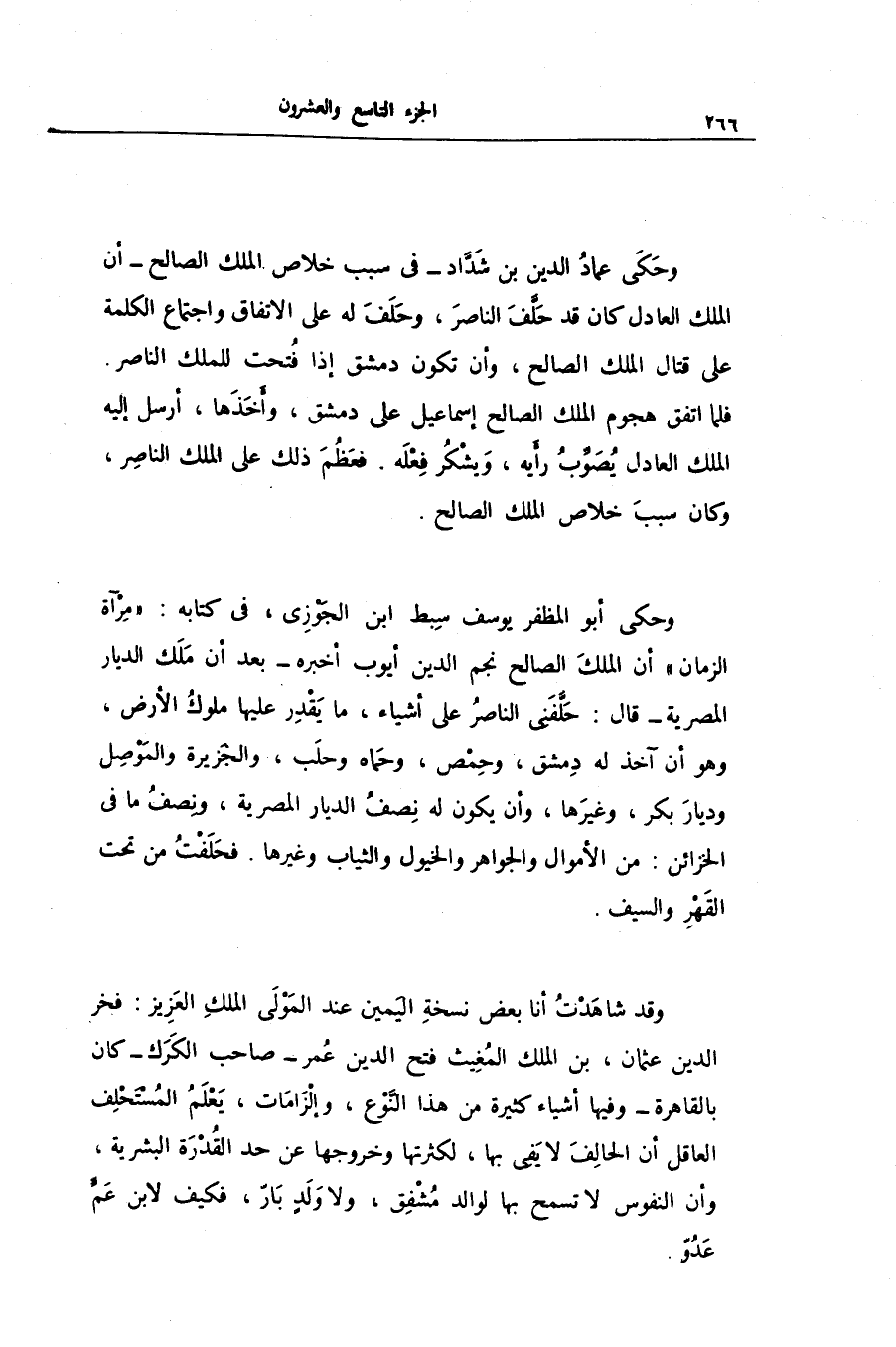 وحكى أبو المظفر يوسف سبط ابن الجوزى، فى كتابه: «مرآة الزمان» أن الملك الصالح نجم الدين أيوب أخبره- بعد أن ملك الديار المصرية- قال: حلّفنى الناصر على أشياء، ما يقدر عليها ملوك الأرض، وهو أن آخذ له دمشق، وحمص، وحماه وحلب، والجزيرة والموصل وديار بكر، وغيرها، وأن يكون له نصف الديار المصرية، ونصف ما فى الخزائن: من الأموال والجواهر والخيول والثياب وغيرها. فحلفت من تحت القهر والسيف.