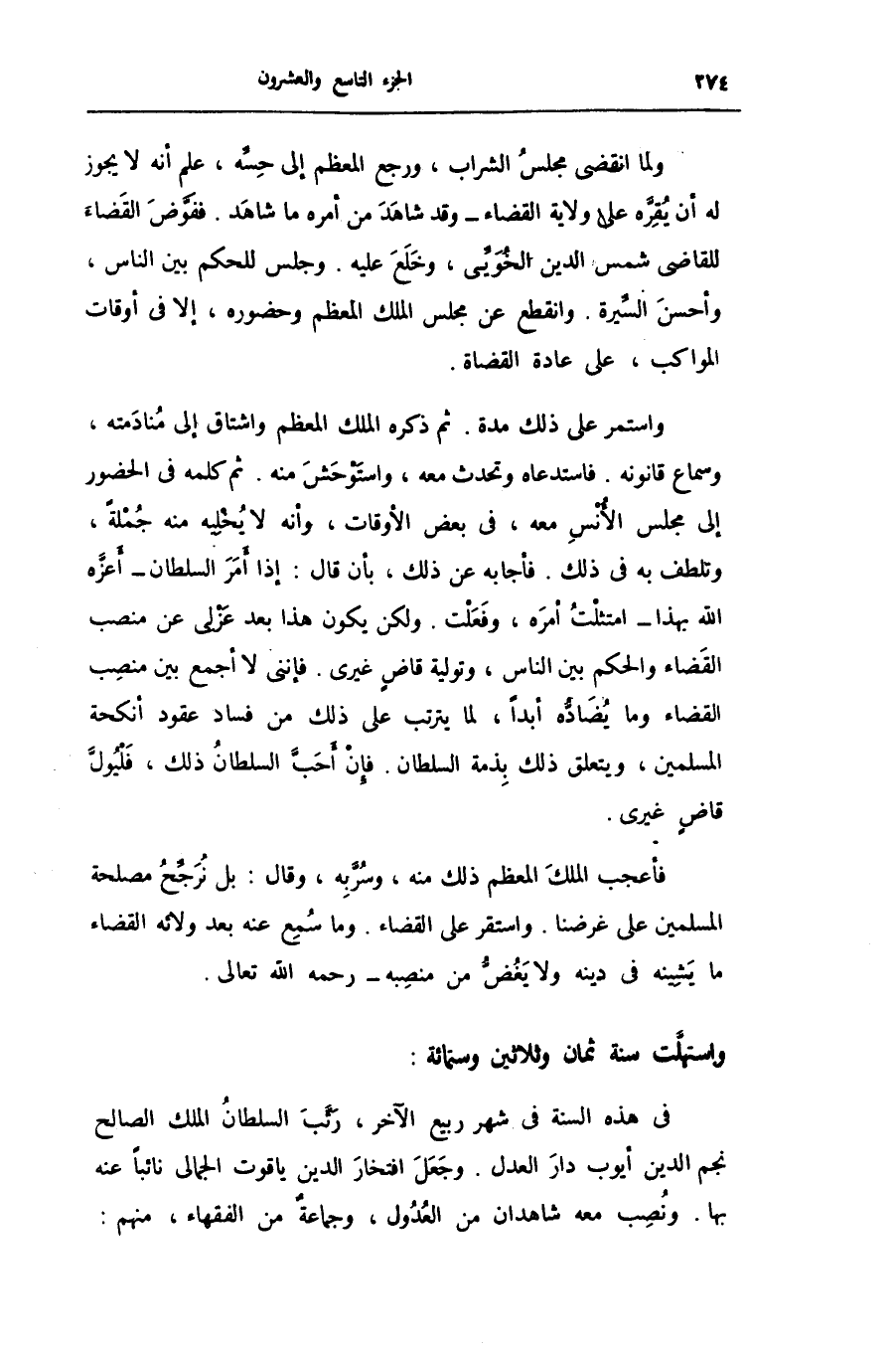 فأعجب الملك المعظم ذلك منه، وسرّبه، وقال: بل نرجّح مصلحة المسلمين على غرضنا. واستقر على القضاء. وما سمع عنه بعد ولائه القضاء ما يشينه فى دينه ولا يغضّ من منصبه- رحمه الله تعالى.