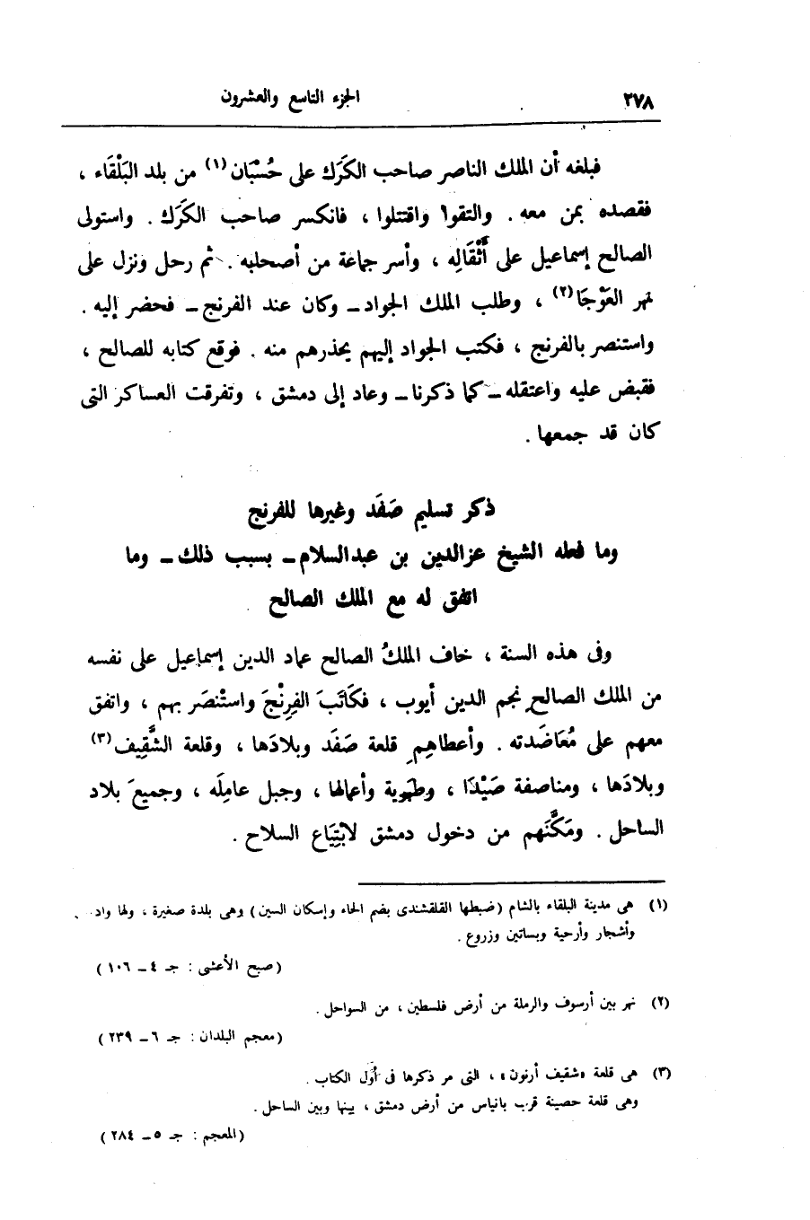 فبلغه أن الملك الناصر صاحب الكرك على حسبان «1» من بلد البلقاء، فقصده بمن معه. والتقوا واقتتلوا، فانكسر صاحب الكرك. واستولى الصالح إسماعيل على أثقاله، وأسر جماعة من أصحابه. ثم رحل ونزل على نهر العوجا «2» ، وطلب الملك الجواد- وكان عند الفرنج- فحضر إليه.