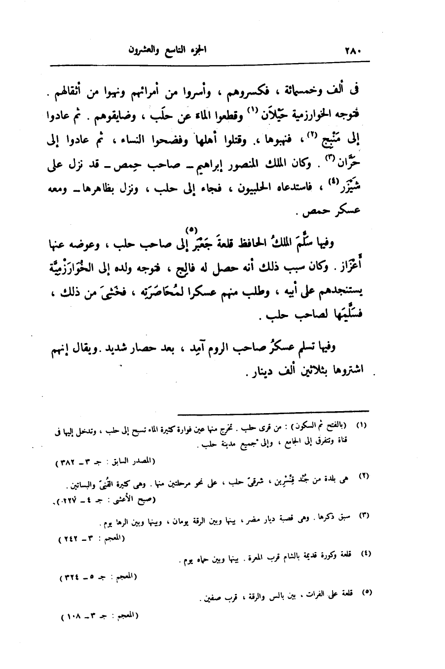 فتوجه الخوارزمية حيلان «1» وقطعوا الماء عن حلب، وضايقوهم. ثم عادوا إلى منبج «2» ، فنهبوها، وقتلوا أهلها وفضحوا النساء، ثم عادوا الى حرّان «3» . وكان الملك المنصور إبراهيم- صاحب حمص- قد نزل على شيزر «4» ، فاستدعاه الحلبيون، فجاء إلى حلب، ونزل بظاهرها- ومعه عسكر حمص.