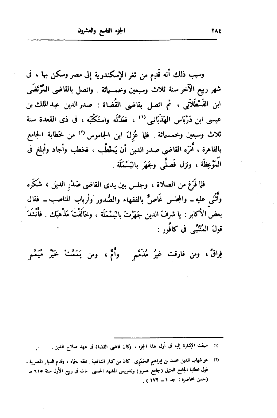 فلما فرغ من الصلاة، وجلس بين يدى القاضى صدر الدين، شكره وأثنى عليه- والمجلس غاصّ بالفقهاء والصّدور وأرباب المناصب- فقال بعض الأكابر: يا شرف الدين جهرت بالبسملة، وخالفت مذهبك. فأنشد قول المتنبّى فى كافور: