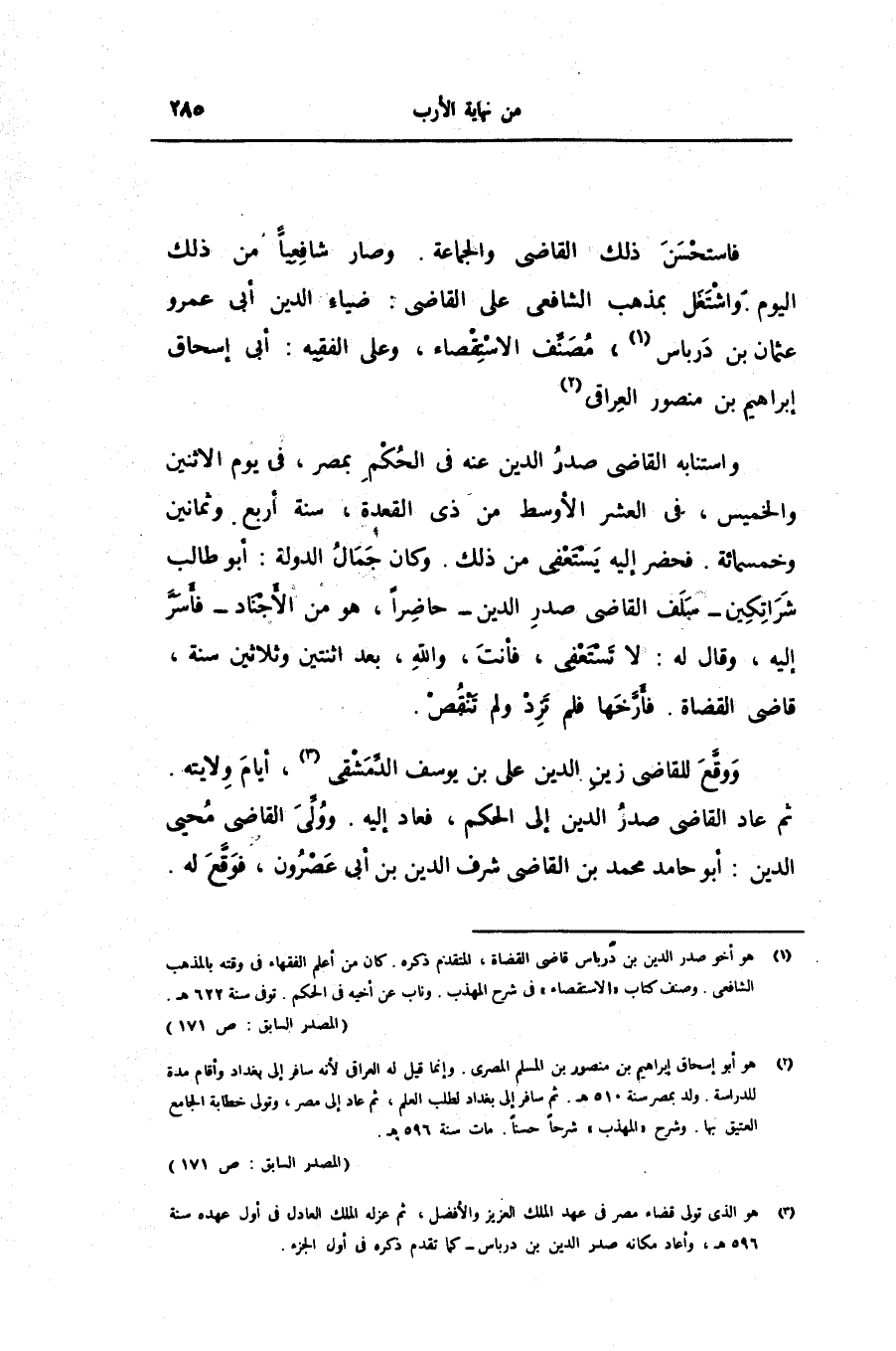 فاستحسن ذلك القاضى والجماعة. وصار شافعيّا من ذلك اليوم. واشتغل بمذهب الشافعى على القاضى: ضياء الدين أبى عمرو عثمان بن درباس «1» ، مصنّف الاستقصاء، وعلى الفقيه: أبى إسحاق إبراهيم بن منصور العراقى «2» واستنابه القاضى صدر الدين عنه فى الحكم بمصر، فى يوم الاثنين والخميس، فى العشر الأوسط من ذى القعدة، سنة أربع وثمانين وخمسمائة. فحضر إليه يستعفى من ذلك. وكان جمال الدولة: أبو طالب شراتكين- سلف القاضى صدر الدين- حاضرا، هو من الأجناد- فأسرّ إليه، وقال له: لا تستعفى، فأنت، والله، بعد اثنتين وثلاثين سنة، قاضى القضاة. فأرّخها فلم تزد ولم تنقص.