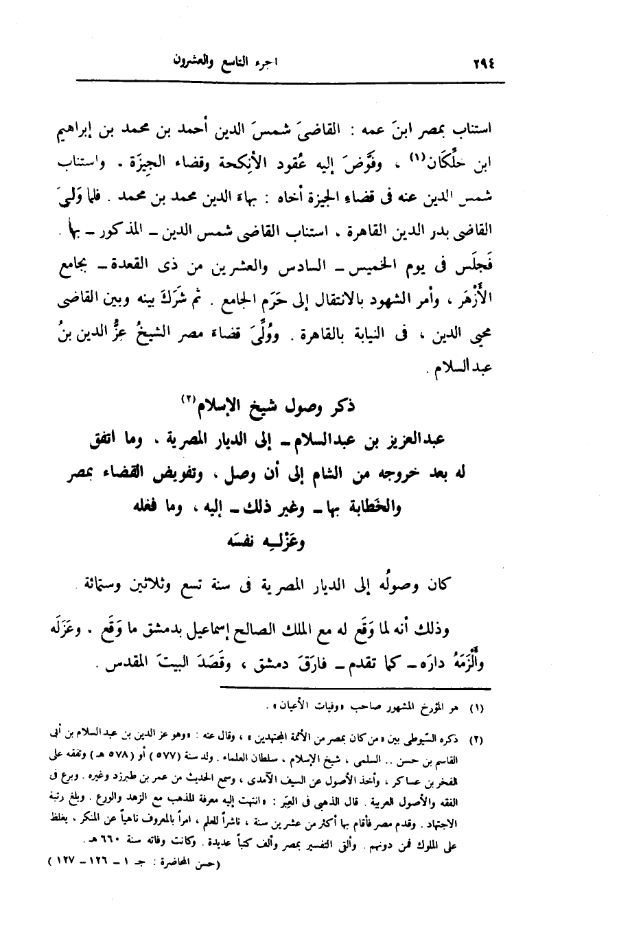 استناب بمصر ابن عمه: القاضى شمس الدين أحمد بن محمد بن إبراهيم ابن خلّكان «1» ، وفوّض إليه عقود الأنكحة وقضاء الجيزة، واستناب شمس الدين عنه فى قضاء الجيزة أخاه: بهاء الدين محمد بن محمد. فلما ولى القاضى بدر الدين القاهرة، استناب القاضى شمس الدين- المذكور- بها فجلس فى يوم الخميس- السادس والعشرين من ذى القعدة- بجامع الأزهر، وأمر الشهود بالانتقال إلى حرم الجامع. ثم شرك بينه وبين القاضى محيى الدين، فى النيابة بالقاهرة. وولّى قضاء مصر الشيخ عزّ الدين بن عبد السلام.