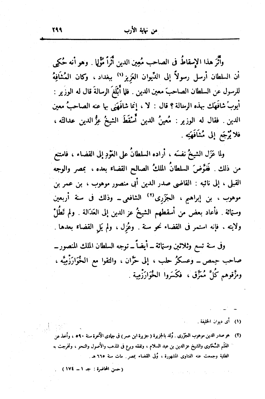 ولما عزل الشيخ نفسه، أراده السلطان على العود إلى القضاء، فامتنع من ذلك. ففوّض السلطان الملك الصالح القضاء بعده، بمصر والوجه القبلى، إلى نائبه: القاضى صدر الدين أبى منصور موهوب، بن عمر بن موهوب، بن إبراهيم، الجزرى «2» الشافعى- وذلك فى سنة أربعين وستمائة. فأعاد بعض من أسقطهم الشيخ عز الدين إلى العدالة. ولم تطل ولايته، فإنه استمر فى القضاء نحو سنة. وعزل، ولم يل القضاء بعدها.