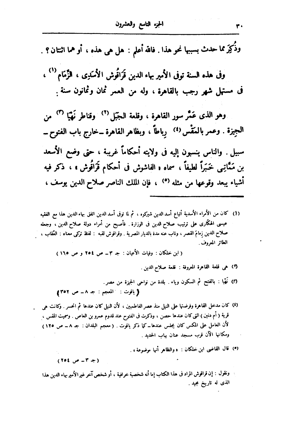 وهو الذى عمّر سور القاهرة، وقلعة الجبل «2» وقناطر نهيا «3» من الجيزة. وعمر بالمقس «4» رباطا، وبظاهر القاهرة- خارج باب الفتوح- سبيل. والناس ينسبون إليه فى ولايته أحكاما غريبة، حتى وضع الأسعد بن ممّاتى خبرا لطيفا، سماه «الفاشوش فى أحكام قراقوش» ، ذكر فيه أشياء يبعد وقوعها من مثله «5» ، فإن الملك الناصر صلاح الدين يوسف،
