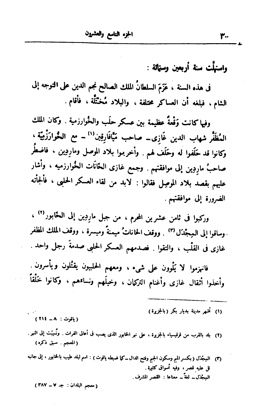 وفيها كانت وقعة عظيمة بين عسكر حلب والخوارزمية. وكان الملك المظفّر شهاب الدين غازى- صاحب ميّافارقين «1» - مع الخوارزميّة، وكانوا قد حلفوا له وحلف لهم. وأخربوا بلاد الموصل وماردين، فاضطر صاحب ماردين إلى موافقتهم. وجمع غازى الخانات الخوارزمية، وأشار عليهم بقصد بلاد الموصل فقالوا: لا بد من لقاء العسكر الحلبى، فألجأته الضرورة إلى موافقتهم.