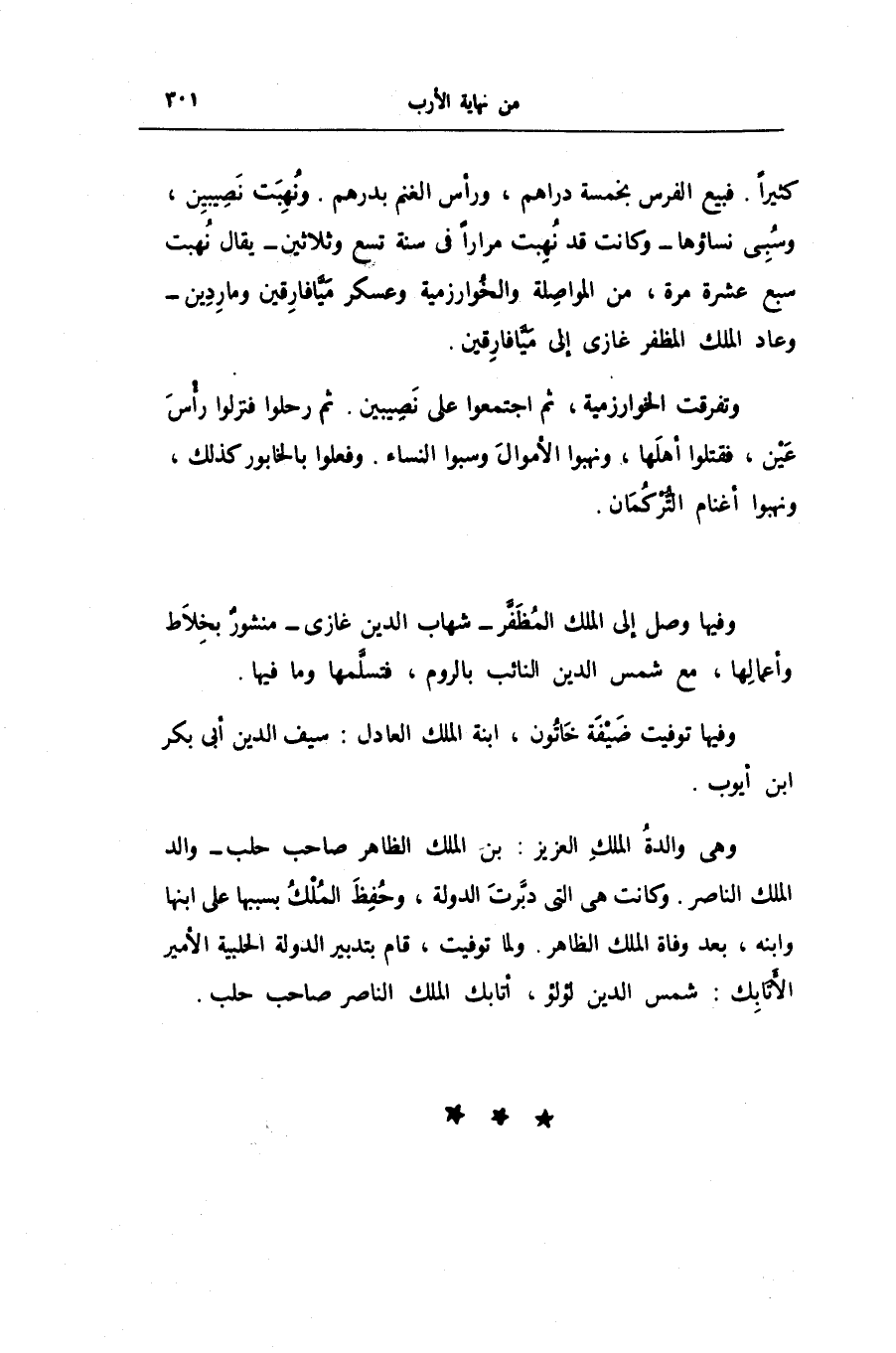 كثيرا. فبيع الفرس بخمسة دراهم، ورأس الغنم بدرهم. ونهبت نصيبين، وسبى نساؤها- وكانت قد نهبت مرارا فى سنة تسع وثلاثين- يقال نهبت سبع عشرة مرة، من المواصلة والخوارزمية وعسكر ميّافارقين وماردين- وعاد الملك المظفر غازى إلى ميّافارقين.