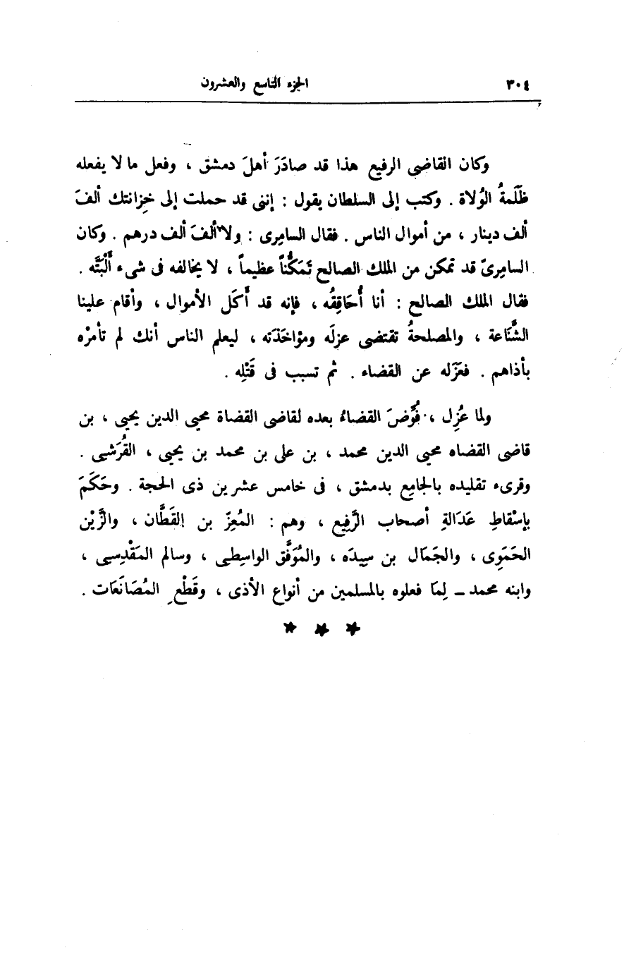 وكان القاضى الرفيع هذا قد صادر أهل دمشق، وفعل ما لا يفعله ظلمة الولاة. وكتب إلى السلطان يقول: إننى قد حملت إلى خزانتك ألف ألف دينار، من أموال الناس. فقال السامرى: ولا ألف ألف درهم. وكان السامرىّ قد تمكن من الملك الصالح تمكّنا عظيما، لا يخالفه فى شىء ألبتّه.