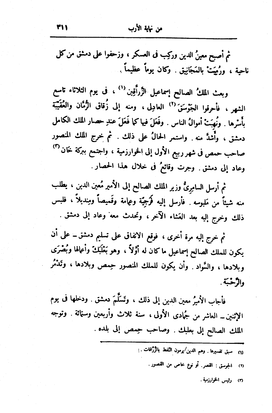 فأجاب الأمير معين الدين إلى ذلك، وتسلّم دمشق. ودخلها فى يوم الإثنين- العاشر من جمادى الأولى، سنة ثلاث وأربعين وستمائة. وتوجه الملك الصالح إلى بعلبك. وصاحب حمص إلى بلده.