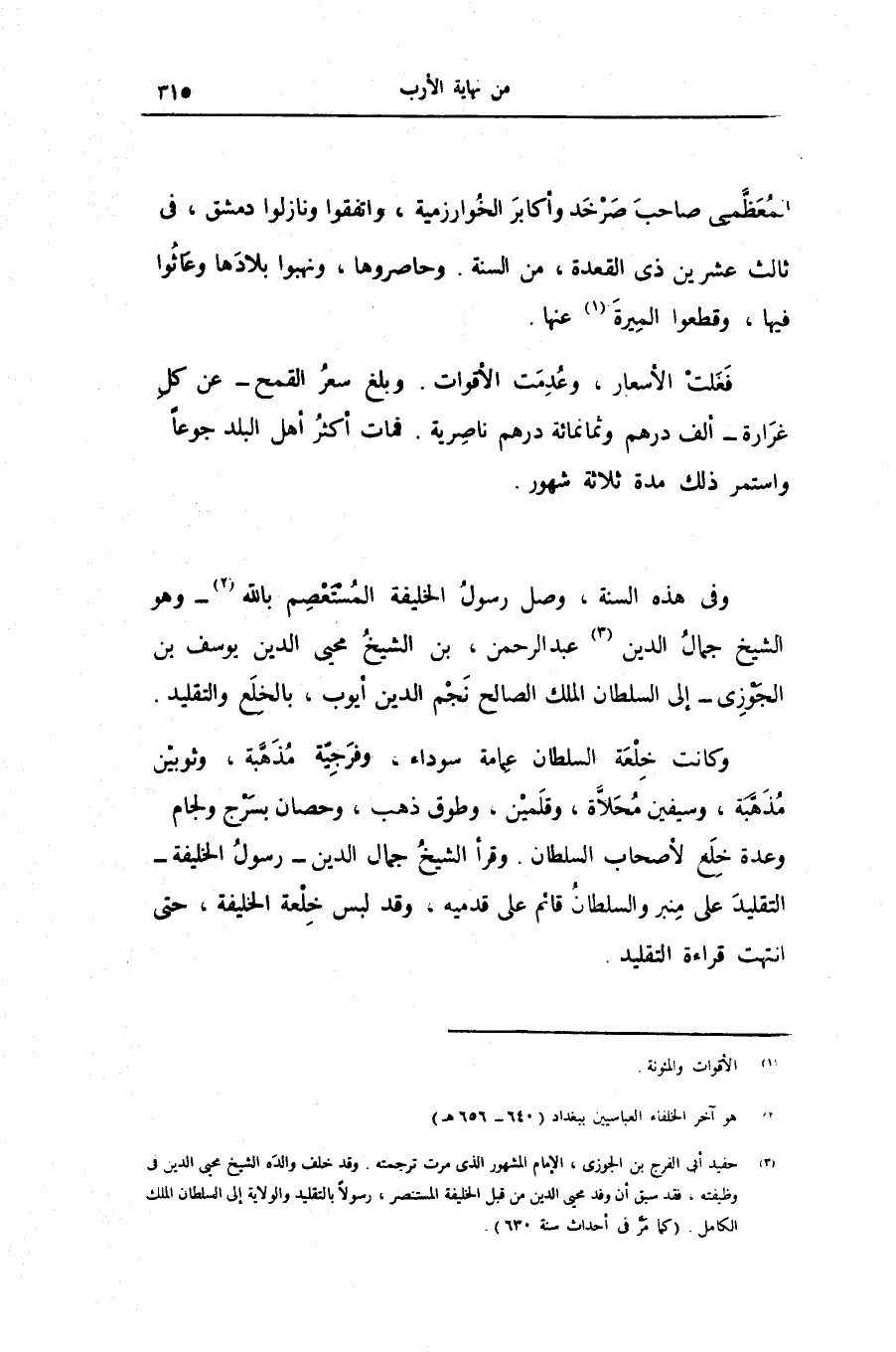 وفى هذه السنة، وصل رسول الخليفة المستعصم بالله «2» - وهو الشيخ جمال الدين «3» عبد الرحمن، بن الشيخ محيى الدين يوسف بن الجوزى- إلى السلطان الملك الصالح نجم الدين أيوب، بالخلع والتقليد.