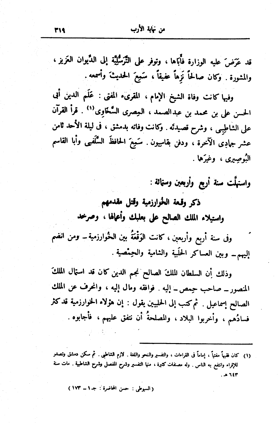 وفى سنة أربع وأربعين، كانت الوقعة بين الخوارزمية- ومن انضم إليهم- وبين العساكر الحلبية والشامية والحمصية.