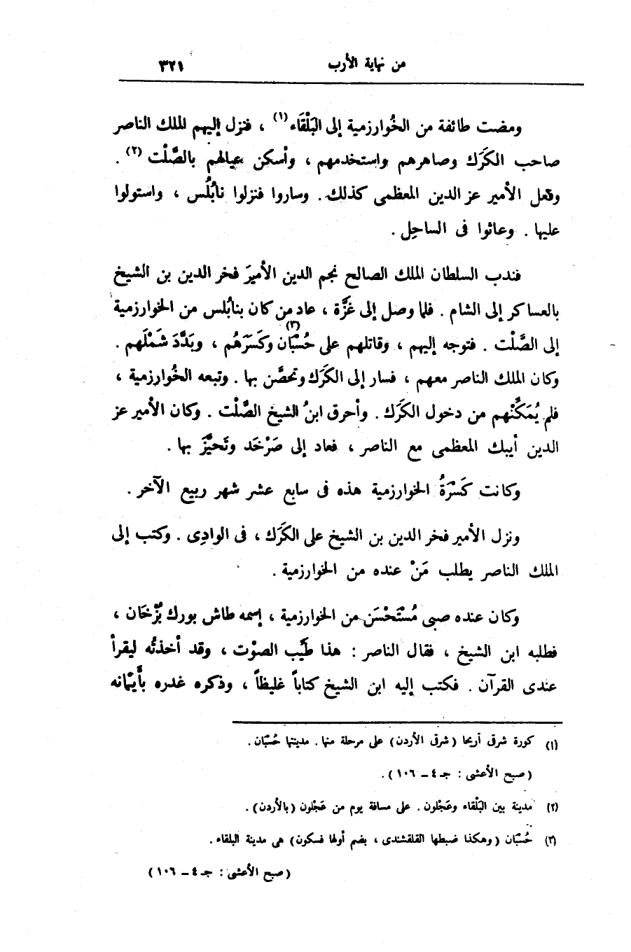 ونزل الأمير فخر الدين بن الشيخ على الكرك، فى الوادى. وكتب إلى الملك الناصر يطلب من عنده من الخوارزمية.