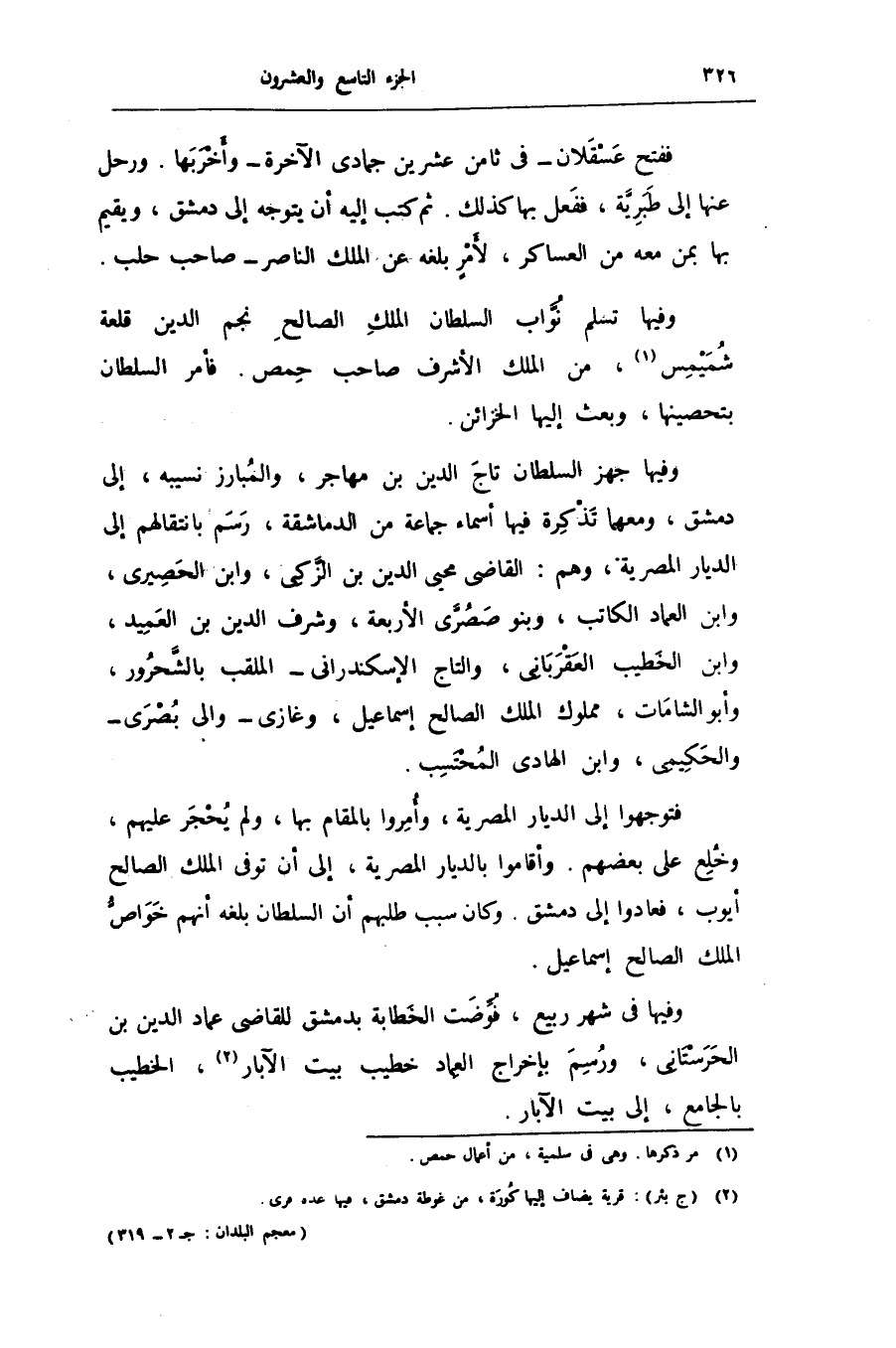 ففتح عسقلان- فى ثامن عشرين جمادى الآخرة- وأخربها. ورحل عنها إلى طبريّة، ففعل بها كذلك. ثم كتب إليه أن يتوجه إلى دمشق، ويقيم بها بمن معه من العساكر، لأمر بلغه عن الملك الناصر- صاحب حلب.