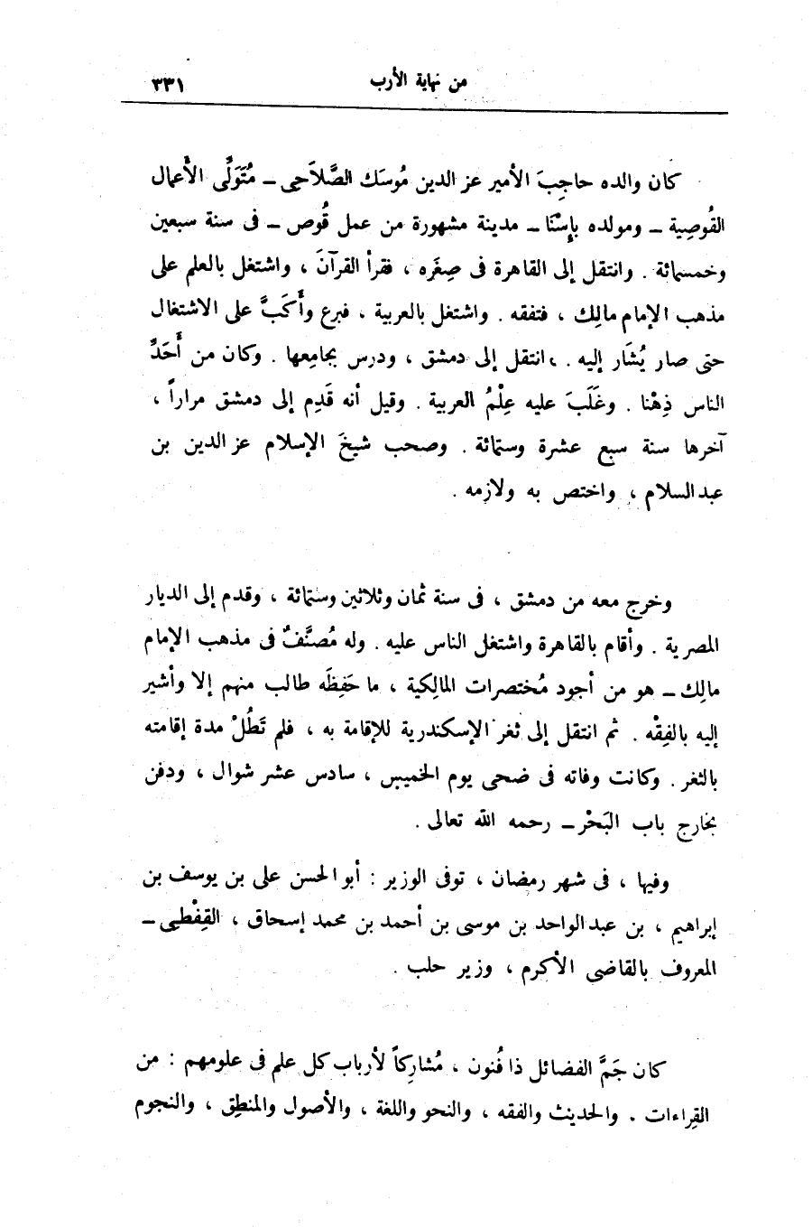 وخرج معه من دمشق، فى سنة ثمان وثلاثين وستمائة، وقدم إلى الديار المصرية. وأقام بالقاهرة واشتغل الناس عليه. وله مصنّف فى مذهب الإمام مالك- هو من أجود مختصرات المالكية، ما حفظه طالب منهم إلا وأشير إليه بالفقه. ثم انتقل إلى ثغر الإسكندرية للإقامة به، فلم تطل مدة إقامته بالثغر. وكانت وفاته فى ضحى يوم الخميس، سادس عشر شوال، ودفن بخارج باب البحر- رحمه الله تعالى.
