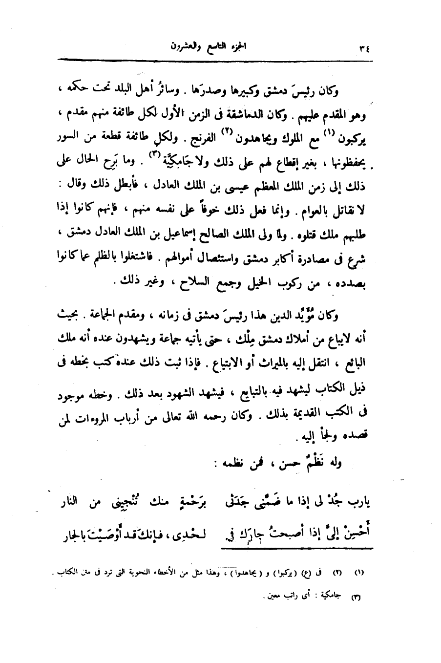 وكان رئيس دمشق وكبيرها وصدرها. وسائر أهل البلد تحت حكمه، وهو المقدم عليهم. وكان الدماشقة فى الزمن الأول لكل طائفة منهم مقدم، يركبون «1» مع الملوك ويجاهدون «2» الفرنج. ولكل طائفة قطعة من السور يحفظونها، بغير إقطاع لهم على ذلك ولا جامكيّة «3» . وما برح الحال على ذلك إلى زمن الملك المعظم عيسى بن الملك العادل، فأبطل ذلك وقال: