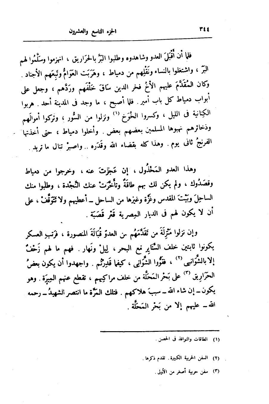 وإن نزلوا منزلة من تقدّمهم من العدوّ قبالة المنصورة، فرتب العسكر يكونوا ثابتين خلف السّتاير مع البحر، ليل ونهار. فهم ما لهم زحف إلا بالشّوانى «2» ، فقوّوا الشّوانى، كيفما قدرتم. واجهدوا أن يكون بعض الحراريق «3» على بحر المحلّة من خلف مراكبهم، تقطع عنهم الميرة. وهو يكون- إن شاء الله- سبب هلاكهم. فتلك المرّة ما انتصر الشهيد- رحمه الله- عليهم إلا من بحر المحلّة.