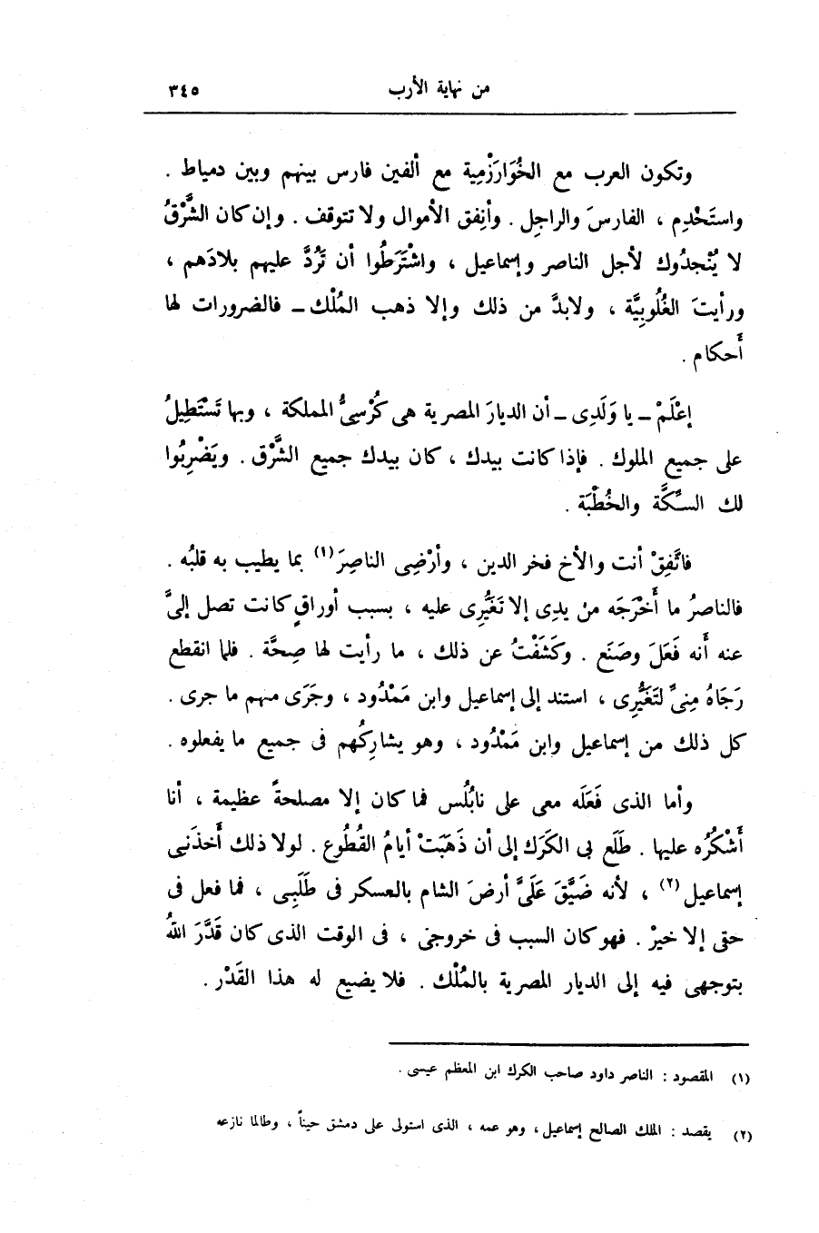 إعلم- يا ولدى- أن الديار المصرية هى كرسىّ المملكة، وبها تستطيل على جميع الملوك. فإذا كانت بيدك، كان بيدك جميع الشّرق. ويضربوا لك السّكّة والخطبة.