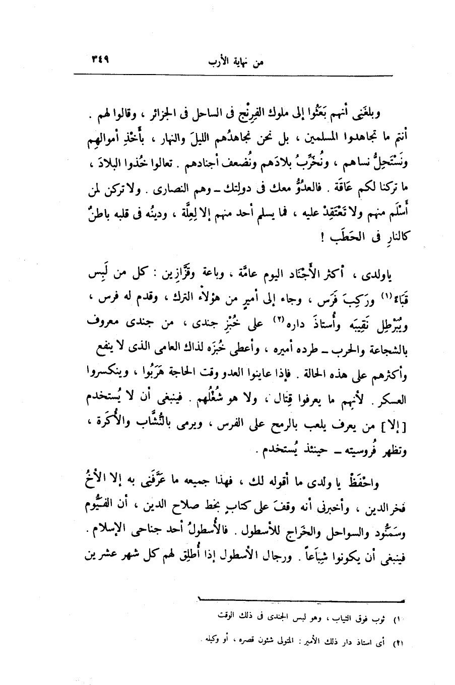 أنتم ما تجاهدوا المسلمين، بل نحن نجاهدهم الليل والنهار، بأخذ أموالهم ونستحلّ نساهم، ونخرّب بلادهم ونضعف أجنادهم. تعالوا خذوا البلاد، ما تركنا لكم عاقة. فالعدوّ معك فى دولتك- وهم النصارى. ولا تركن لمن أسلم منهم ولا تعتقد عليه، فما يسلم أحد منهم إلا لعلّة، ودينه فى قلبه باطن كالنار فى الحطب! يا ولدى، أكثر الأجناد اليوم عامّة، وباعة وقزّازين: كل من لبس قباء «1» وركب فرس، وجاء إلى أمير من هؤلاء الترك، وقدم له فرس، ويبرطل نقيبه وأستاذ داره «2» على خبز جندى، من جندى معروف بالشجاعة والحرب- طرده أميره، وأعطى خبزه لذاك العامى الذى لا ينفع وأكثرهم على هذه الحالة. فإذا عاينوا العدو وقت الحاجة هربوا، وينكسروا العسكر. لأنهم ما يعرفوا قتال، ولا هو شغلهم. فينبغى أن لا يستخدم [إلا] من يعرف يلعب بالرمح على الفرس، ويرمى بالنّشّاب والأكرة، وتظهر فروسيته- حينئذ يستخدم.