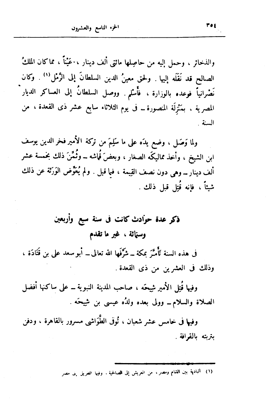 والذخائر، وحمل إليه من حاصلها مائتى ألف دينار، عينا، مما كان الملك الصالح قد نقله إليها. ولحق معين الدين السلطان إلى الرّمل «1» . وكان نصرانيا فوعده بالوزارة، فأسلم. ووصل السلطان إلى العساكر الديار المصرية، بمنزلة المنصورة- فى يوم الثلاثاء سابع عشر ذى القعدة، من السنة.