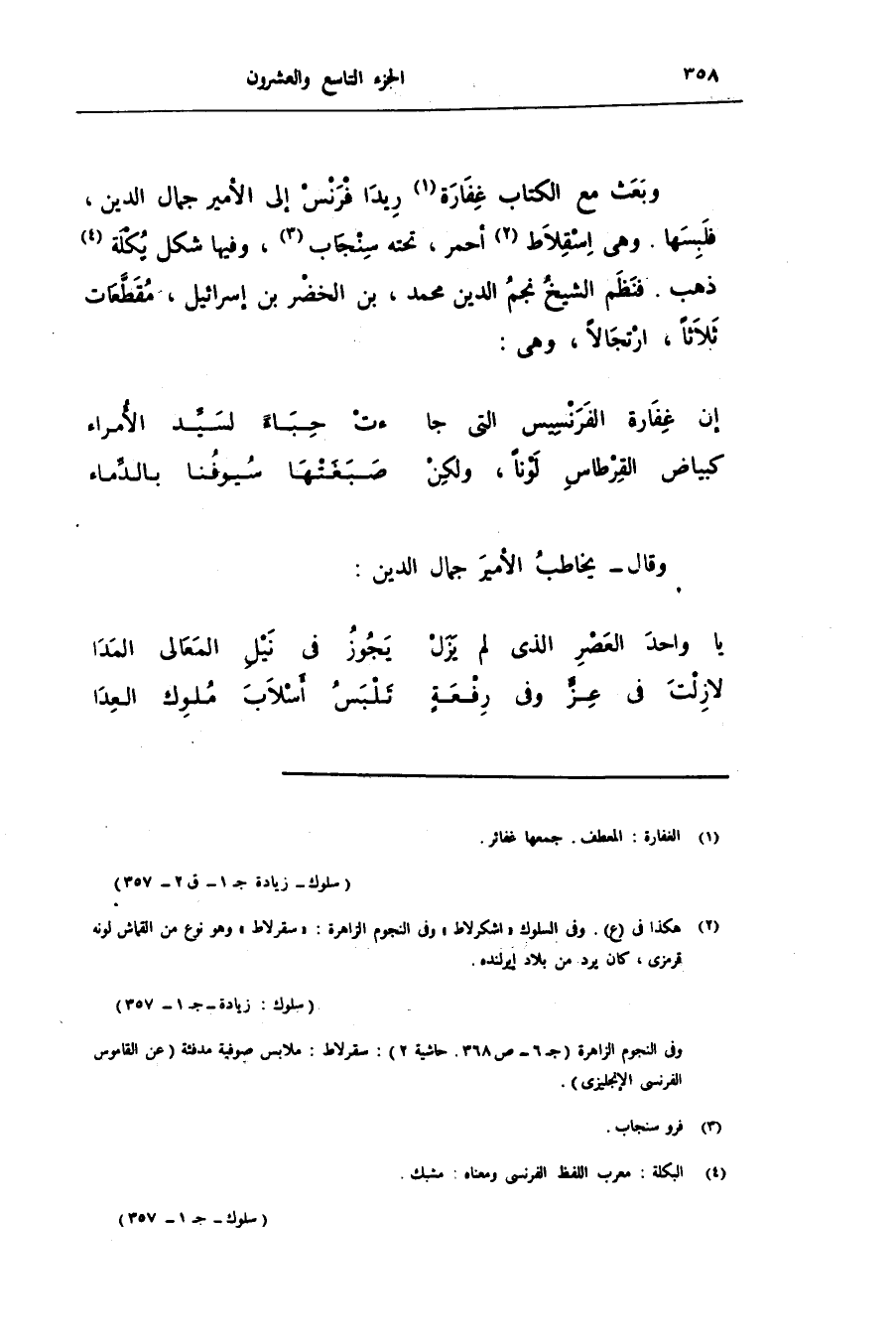 وبعث مع الكتاب غفارة «1» ريدا فرنس إلى الأمير جمال الدين، فلبسها. وهى اسقلاط «2» أحمر، تحته سنجاب «3» ، وفيها شكل يكلة «4» ذهب. فنظم الشيخ نجم الدين محمد، بن الخضر بن إسرائيل، مقطّعات ثلاثا، ارتجالا، وهى: