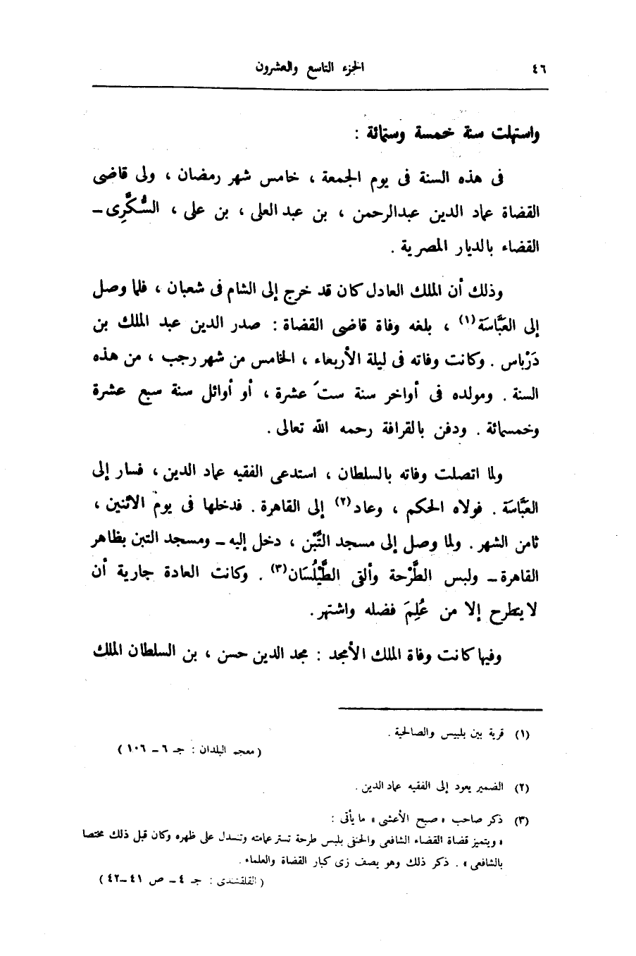ولما اتصلت وفاته بالسلطان، استدعى الفقيه عماد الدين، فسار إلى العبّاسة. فولاه الحكم، وعاد «2» إلى القاهرة. فدخلها فى يوم الاثنين، ثامن الشهر. ولما وصل إلى مسجد التّبن، دخل إليه- ومسجد التبن بظاهر القاهرة- ولبس الطّرحة وألقى الطّيلسان «3» . وكانت العادة جارية أن لا يتطرح إلا من علم فضله واشتهر.