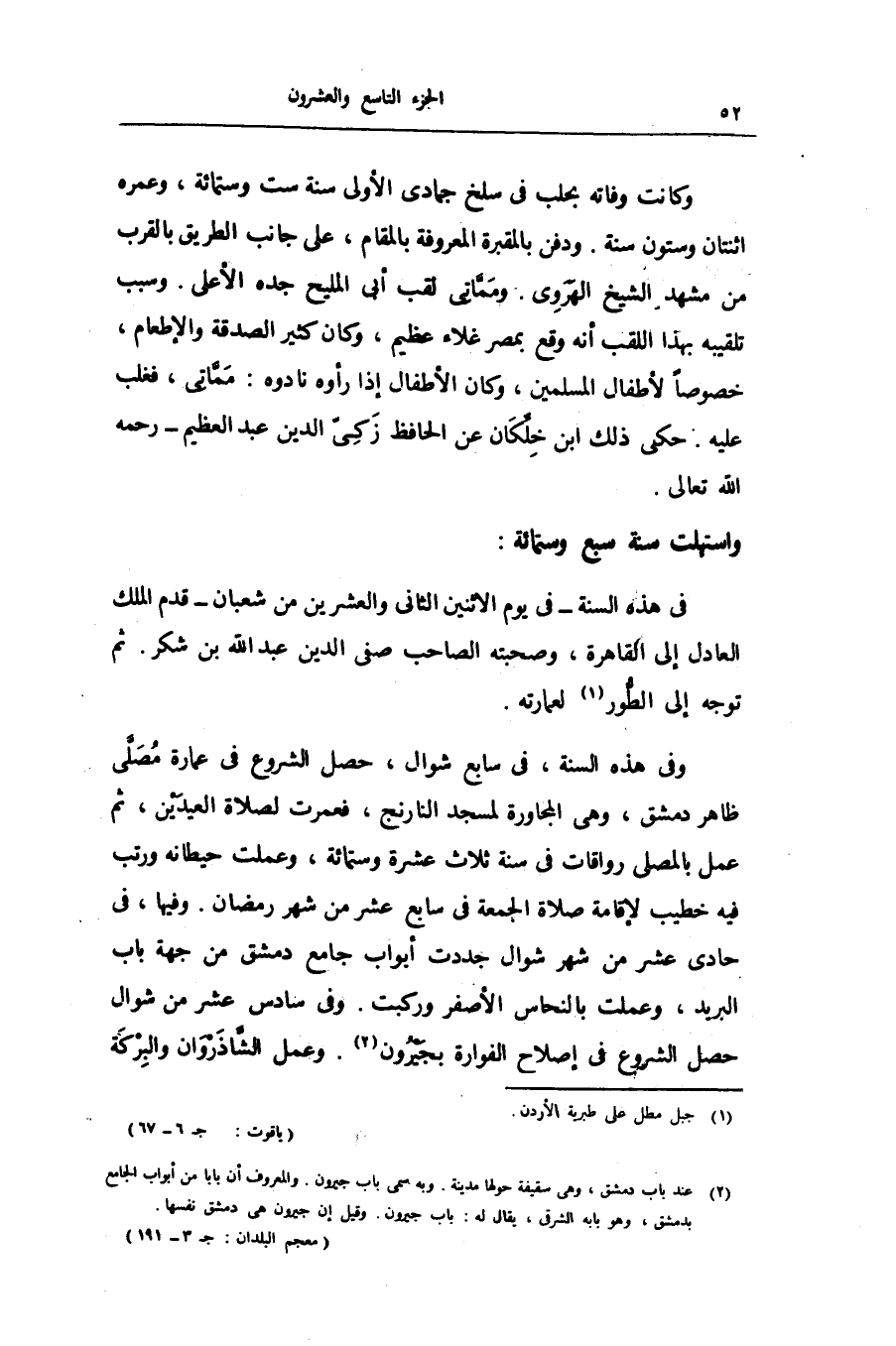 وفى هذه السنة، فى سابع شوال، حصل الشروع فى عمارة مصلّى ظاهر دمشق، وهى المجاورة لمسجد النارنج، فعمرت لصلاة العيدين، ثم عمل بالمصلى رواقات فى سنة ثلاث عشرة وستمائة، وعملت حيطانه ورتب فيه خطيب لإقامة صلاة الجمعة فى سابع عشر من شهر رمضان. وفيها، فى حادى عشر من شهر شوال جددت أبواب جامع دمشق من جهة باب البريد، وعملت بالنحاس الأصفر وركبت. وفى سادس عشر من شوال حصل الشروع فى إصلاح الفوارة بجيرون «2» . وعمل الشّاذروان والبركة