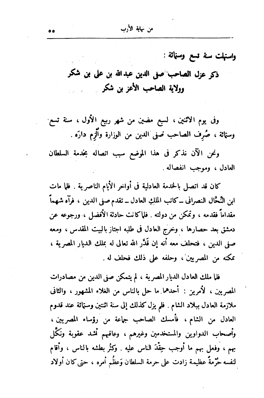وفى يوم الاثنين، لسبع مضين من شهر ربيع الأول، سنة تسع وستمائة، صرف الصاحب صفى الدين من الوزارة والزم داره.