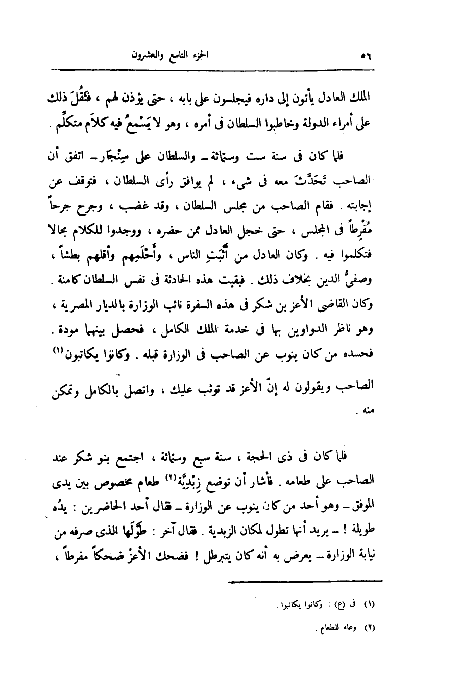 فلما كان فى ذى الحجة، سنة سبع وستمائة، اجتمع بنو شكر عند الصاحب على طعامه. فأشار أن توضع زبديّة «2» طعام مخصوص بين يدى الموفق- وهو أحد من كان ينوب عن الوزارة- فقال أحد الحاضرين: يده طويلة! - يريد أنها تطول لمكان الزبدية. فقال آخر: طوّلها الذى صرفه من نيابة الوزارة- يعرض به أنه كان يتبرطل! فضحك الأعز ضحكا مفرطا،