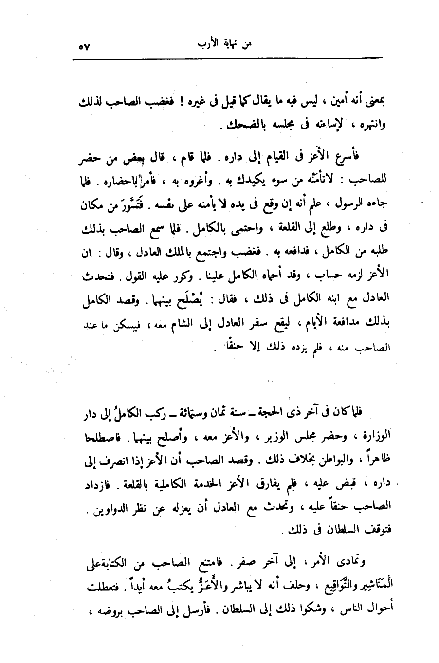 فأسرع الأعز فى القيام إلى داره. فلما قام، قال بعض من حضر للصاحب: لا تأمنه من سوء يكيدك به. وأغروه به، فأمر باحضاره. فلما جاءه الرسول، علم أنه إن وقع فى يده لا يأمنه على نفسه. فتسّور من مكان فى داره، وطلع إلى القلعة، واحتمى بالكامل. فلما سمع الصاحب بذلك طلبه من الكامل، فدافعه به. فغضب واجتمع بالملك العادل، وقال: ان الأعز لزمه حساب، وقد أحماه الكامل علينا. وكرر عليه القول. فتحدث العادل مع ابنه الكامل فى ذلك، فقال: يصلح بينهما. وقصد الكامل بذلك مدافعة الأيام، ليقع سفر العادل إلى الشام معه، فيسكن ما عند الصاحب منه، فلم يزده ذلك إلا حنقا.