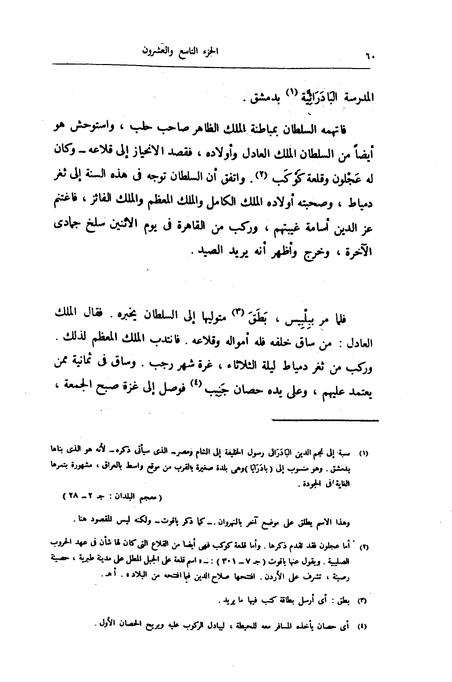 فاتهمه السلطان بمباطنة الملك الظاهر صاحب حلب، واستوحش هو أيضا من السلطان الملك العادل وأولاده، فقصد الانحياز إلى قلاعه- وكان له عجلون وقلعة كوكب «2» . واتفق أن السلطان توجه فى هذه السنة إلى ثغر دمياط، وصحبته أولاده الملك الكامل والملك المعظم والملك الفائز، فاغتنم عز الدين أسامة غيبتهم، وركب من القاهرة فى يوم الاثنين سلخ جمادى الآخرة، وخرج وأظهر أنه يريد الصيد.