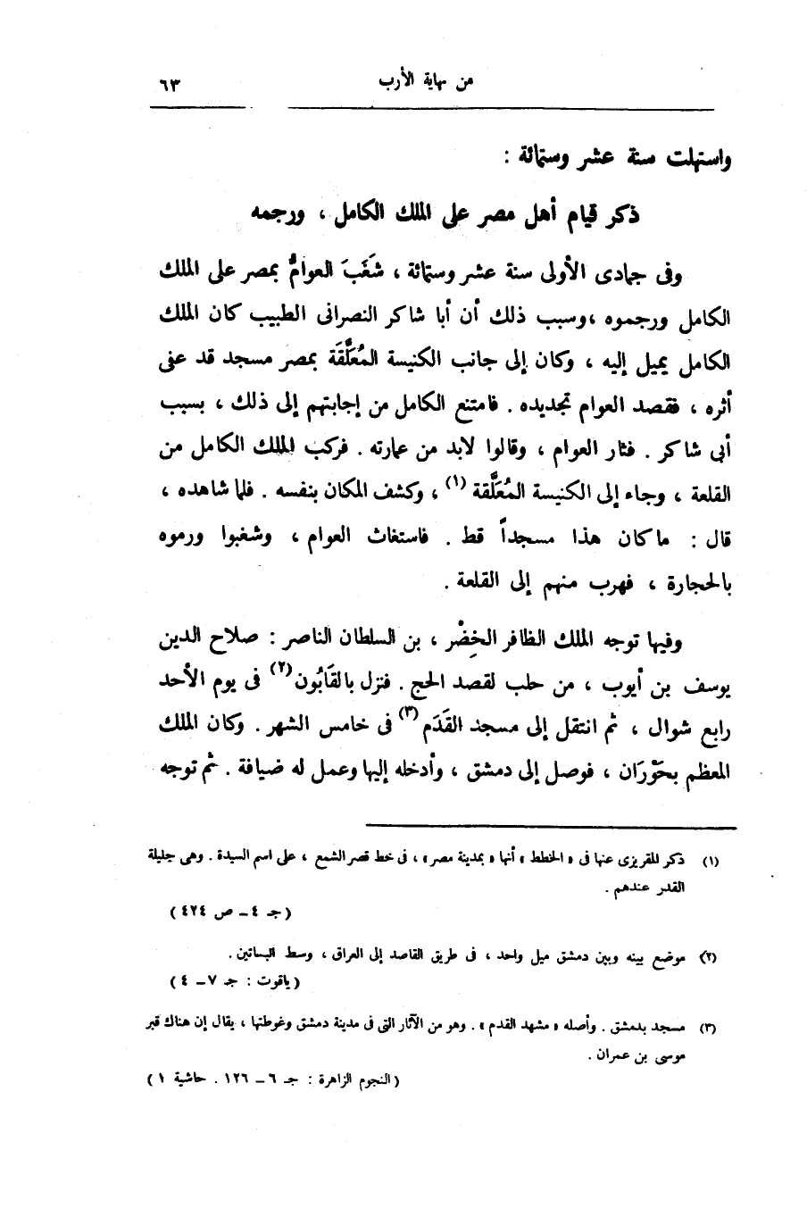 وفى جمادى الأولى سنة عشر وستمائة، شغب العوامّ بمصر على الملك الكامل ورجموه، وسبب ذلك أن أبا شاكر النصرانى الطبيب كان الملك الكامل يميل إليه، وكان إلى جانب الكنيسة المعلّقة بمصر مسجد قد عفى أثره، فقصد العوام تجديده. فامتنع الكامل من إجابتهم إلى ذلك، بسبب أبى شاكر. فثار العوام، وقالوا لا بد من عمارته. فركب الملك الكامل من القلعة، وجاء إلى الكنيسة المعلّقة «1» ، وكشف المكان بنفسه. فلما شاهده، قال: ما كان هذا مسجدا قط. فاستغاث العوام، وشغبوا ورموه بالحجارة، فهرب منهم إلى القلعة.