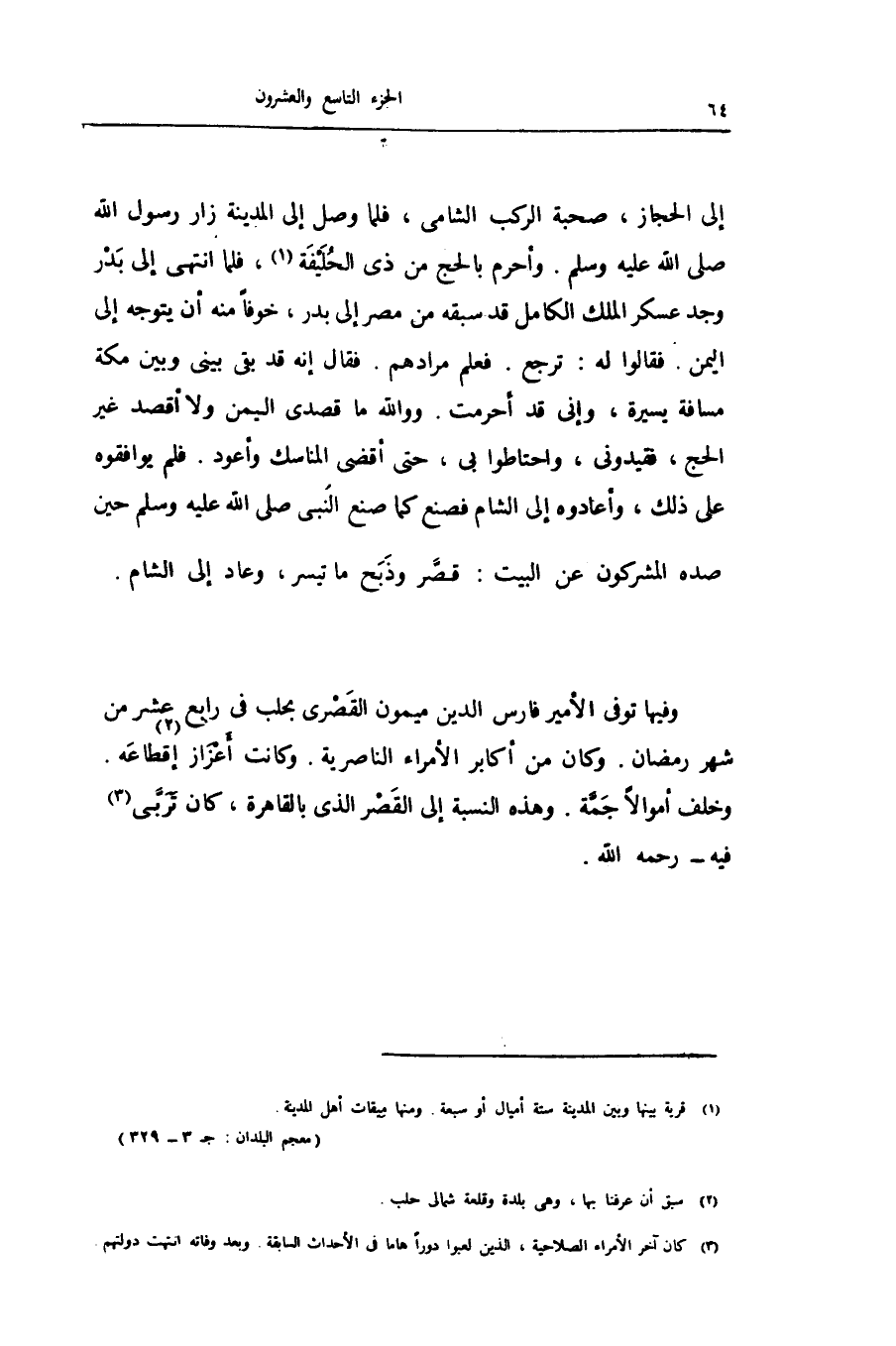 إلى الحجاز، صحبة الركب الشامى، فلما وصل إلى المدينة زار رسول الله صلى الله عليه وسلم. وأحرم بالحج من ذى الحليفة «1» ، فلما انتهى إلى بدر وجد عسكر الملك الكامل قد سبقه من مصر إلى بدر، خوفا منه أن يتوجه إلى اليمن. فقالوا له: ترجع. فعلم مرادهم. فقال إنه قد بقى بينى وبين مكة مسافة يسيرة، وانى قد أحرمت. وو الله ما قصدى اليمن ولا أقصد غير الحج، فقيدونى، واحتاطوا بى، حتى أقضى المناسك وأعود. فلم يوافقوه على ذلك، وأعادوه إلى الشام فصنع كما صنع النبى صلى الله عليه وسلم حين صده المشركون عن البيت: قصّر وذبح ما تيسر، وعاد إلى الشام.