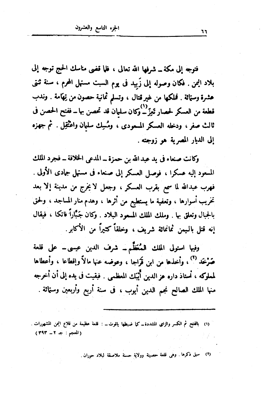 فتوجه إلى مكة- شرفها الله تعالى، فلما قضى مناسك الحج توجه إلى بلاد اليمن. فكان وصوله إلى زبيد فى يوم السبت مستهل المحرم، سنة ثنتى عشرة وستمائة. فملكها من غير قتال، وتسلم ثمانية حصون من تهامة. وندب قطعة من العسكر لحصار تعزّ «1» - وكان سليمان قد تحصن بها- ففتح الحصن فى ثالث صفر، ودخله العسكر المسعودى، ومسك سليمان واعتقل. ثم جهزه إلى الديار المصرية هو زوجته.