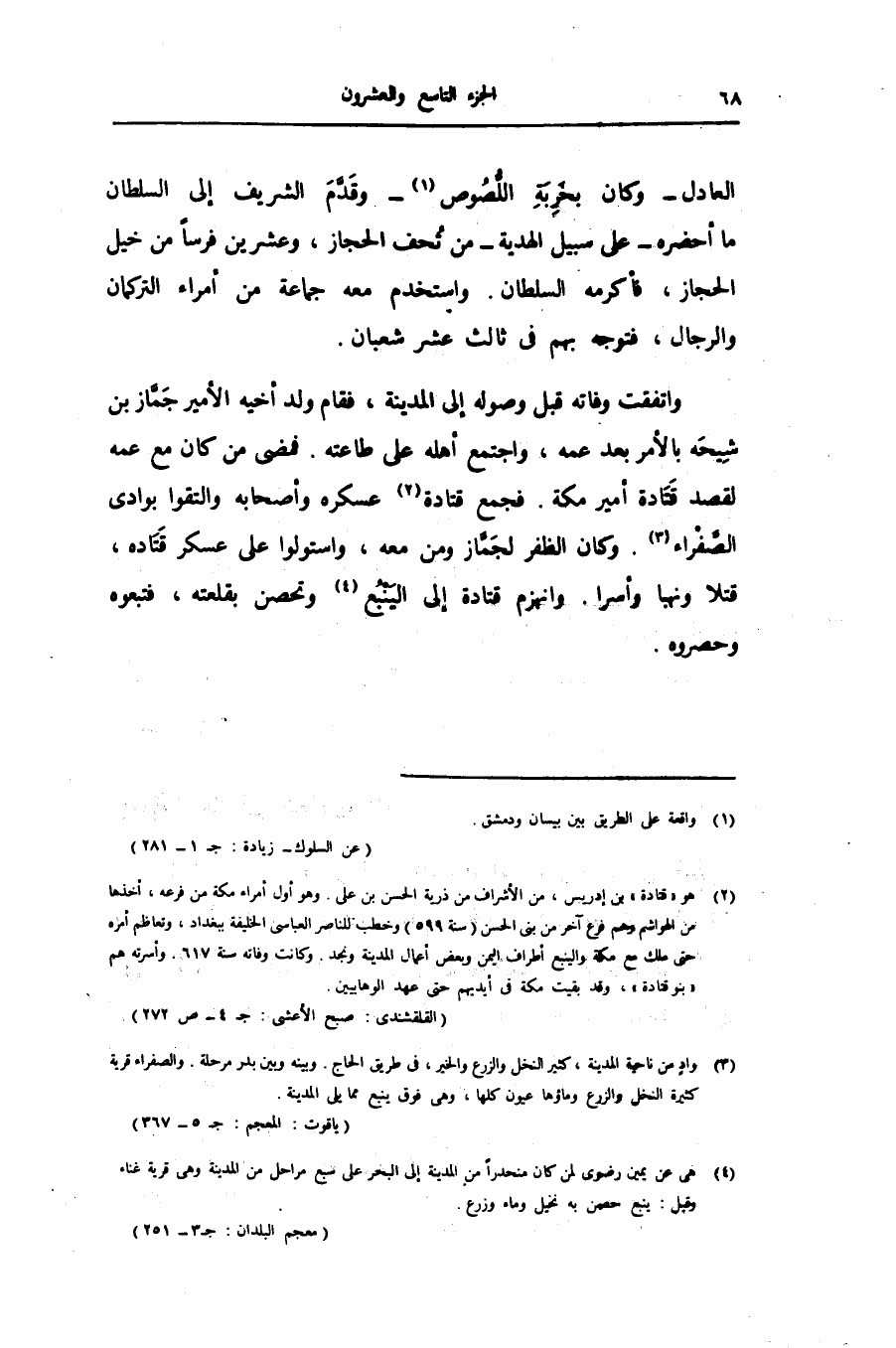 واتفقت وفاته قبل وصوله إلى المدينة، فقام ولد أخيه الأمير جمّاز بن شيحه بالأمر بعد عمه، واجتمع أهله على طاعته. فمضى من كان مع عمه لقصد قتادة أمير مكة. فجمع قتادة «2» عسكره وأصحابه والتقوا بوادى الصّفراء «3» . وكان الظفر لجمّاز ومن معه، واستولوا على عسكر قتاده، قتلا ونهبا وأسرا. وانهزم قتادة إلى الينبع «4» وتحصن بقلعته، فتبعوه وحصروه.