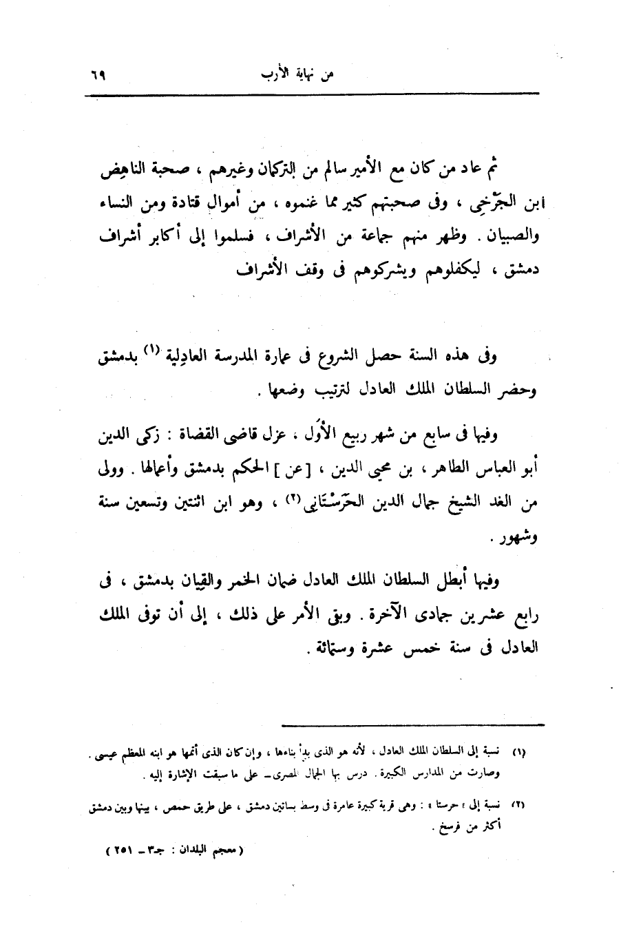 ثم عاد من كان مع الأمير سالم من التركمان وغيرهم، صحبة الناهض ابن الجرخى، وفى صحبتهم كثير مما غنموه، من أموال قتادة ومن النساء والصبيان. وظهر منهم جماعة من الأشراف، فسلموا إلى أكابر أشراف دمشق، ليكفلوهم ويشركوهم فى وقف الأشراف وفى هذه السنة حصل الشروع فى عمارة المدرسة العادلية «1»