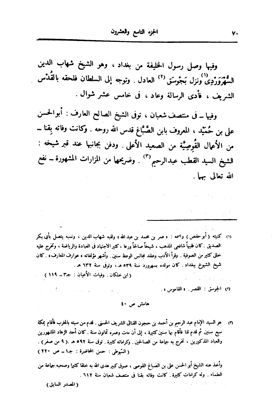 وفيها وصل رسول الخليفة من بغداد، وهو الشيخ شهاب الدين السّهروردى «1» ونزل بجوسق «2» العادل. وتوجه إلى السلطان فلحقه بالقدس الشريف، فأدى الرسالة وعاد، فى خامس عشر شوال.